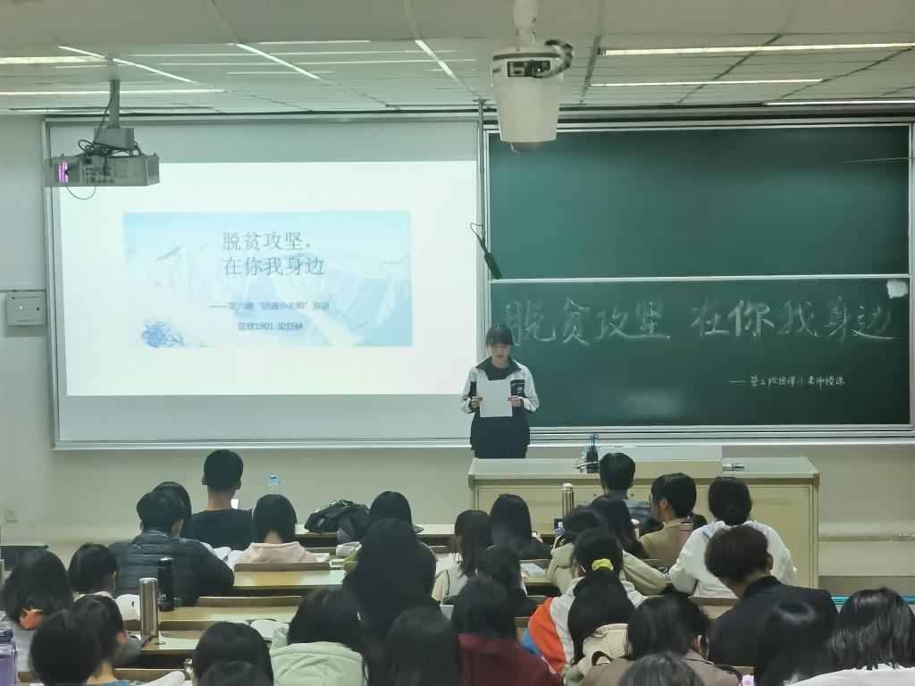 为贯彻落实国务院提出的动员全国全党全社会的力量开展脱贫攻坚工作的理念,让学院新生更加清楚地认识个人价值、体会脱贫攻坚的重要意义,williamhill英国于11月12日晚8点在博远楼JC204教室成功举办“脱贫攻坚,在你我身边”团课小老师梦想公开课。本次公开课由团课小老师梁舒越主讲,学院全体新生悉数参加。