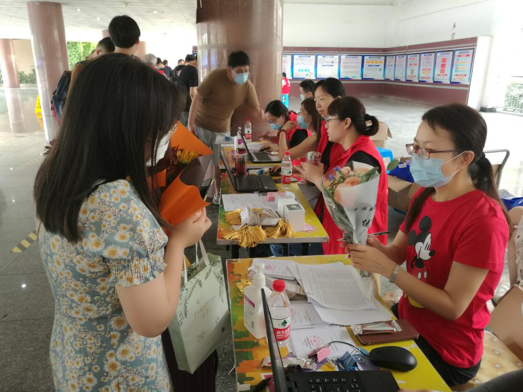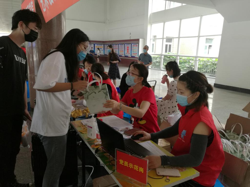 返校现场秩序井然。按照“一测二核三查”的要求,毕业生在学校南门有序排队进行报到确认和体温检测。在教职工党员志愿者的引导下,毕业生前往学院现场报到点,领取了学院的毕业伴手礼。院工作人员核对健康名单,核查“苏康码”和个人旅行轨迹信息,检测体温,发放报到证。学校为毕业生统一安排了校车,将毕业生送至学生公寓,由宿舍管理人员进行第三次体温检测,测温正常后进入公寓。