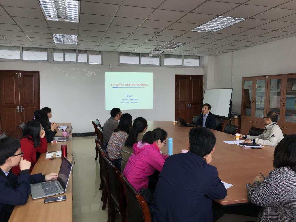 樊教授首先介绍了在线评价/评论管理决策在企业和公共部门管理中的重要作用,探讨了基于在线评价/评论管理决策七个方面的研究问题,介绍了从事该领域研究应该具备的方法和技术,指出了该领域目前的主要研究热点。樊教授在报告中,分享了其多年的科研经验,师生们感觉受益匪浅。