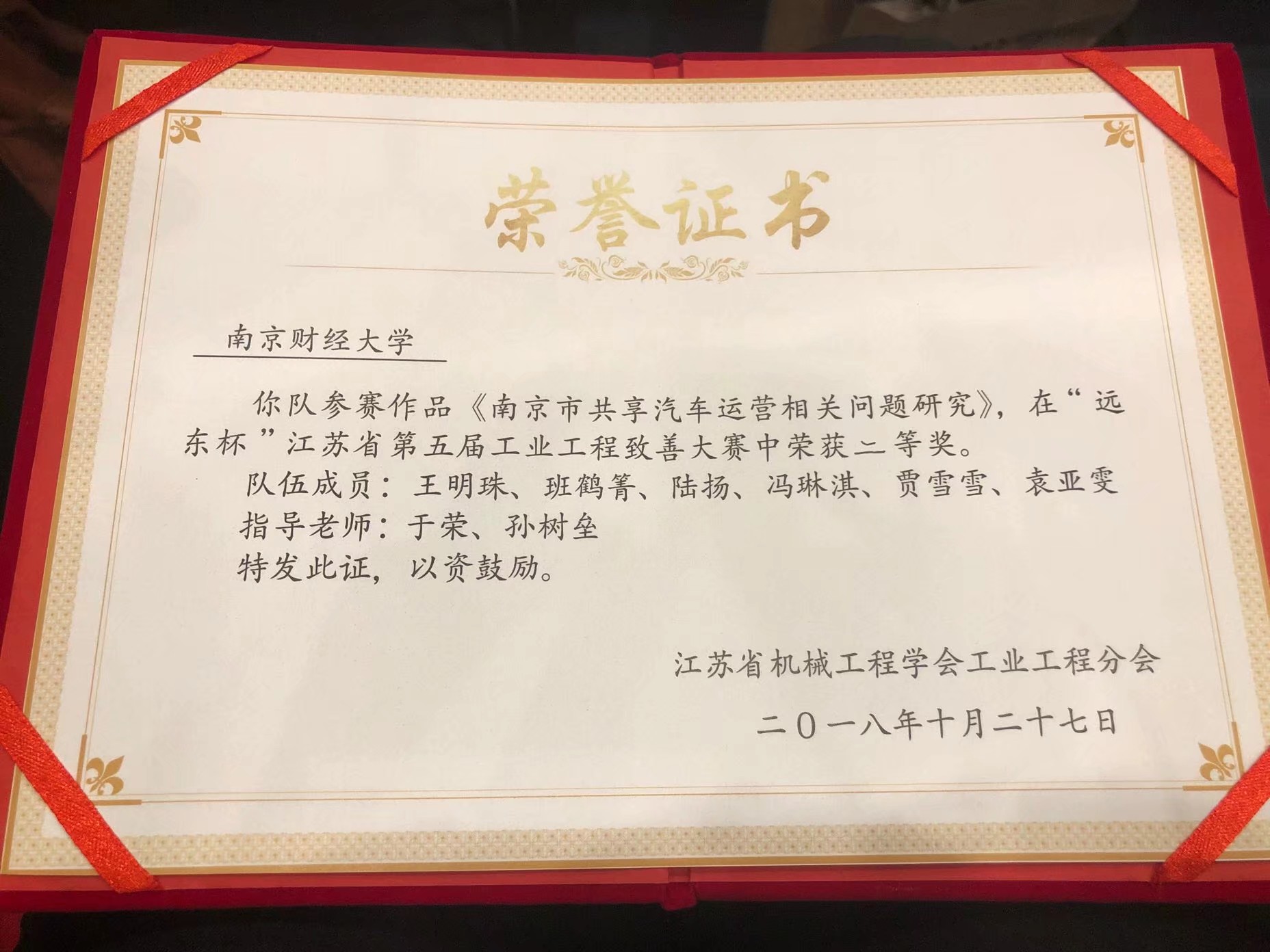 月27日上午9点,江苏省机械工程学会工业工程分会年会暨“远东杯”第五届江苏省工业工程致善大赛在江南大学远东报告厅成功举行。本届大赛由江苏省机械工程学会工业工程分会主办,江南大学商学院、远东控股集团有限公司承办,来自南京航空航天大学、南京理工大学、中国矿业大学、英国威廉集团等高校的21支队伍参与决赛。最终,经过激烈角逐,结合书面评审与现场答辩考核成绩,由我校williamhill英国管理科学系于荣、工业工程系孙树垒指导,王明珠、陆扬、班鹤箐、袁亚雯、贾雪雪、冯琳淇本科生共同完成的项目《南京市共享汽车运营相关问题研究》获得二等奖。
