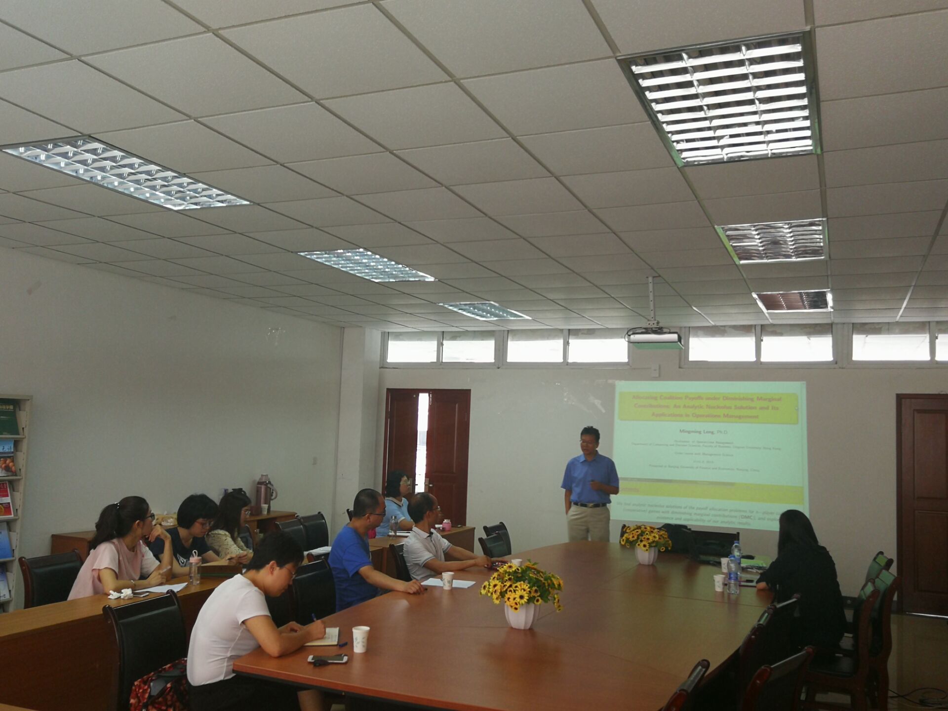 6月8日上午,应williamhill英国的邀请,香港岭南大学冷明明教授为师生做了题为《Allocating Coalition Payoffs under Diminishing Marginal Contributions》的研究报告,会议由黄健教授主持。冷教授首先介绍了合作博弈的相关概念及其在现实中的应用。然后讲解了他的关于DMC game的最新研究成果。