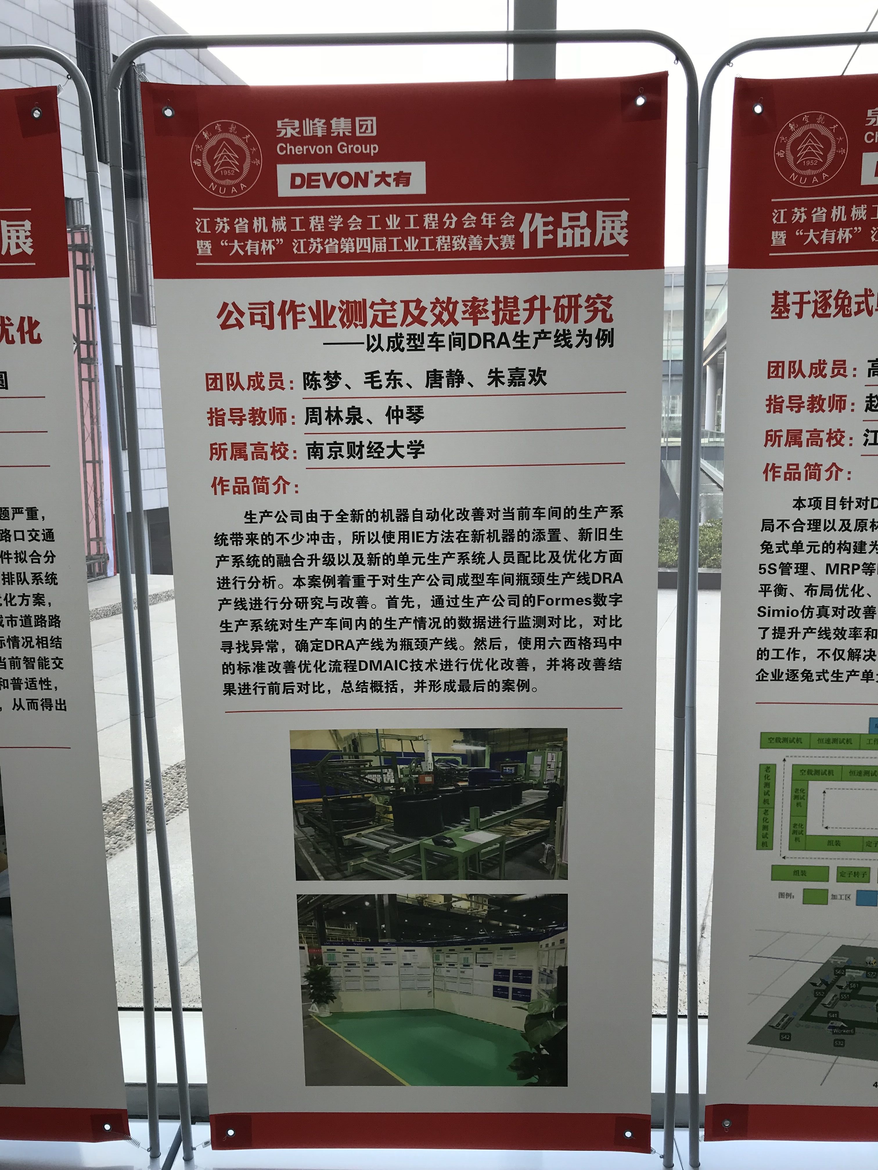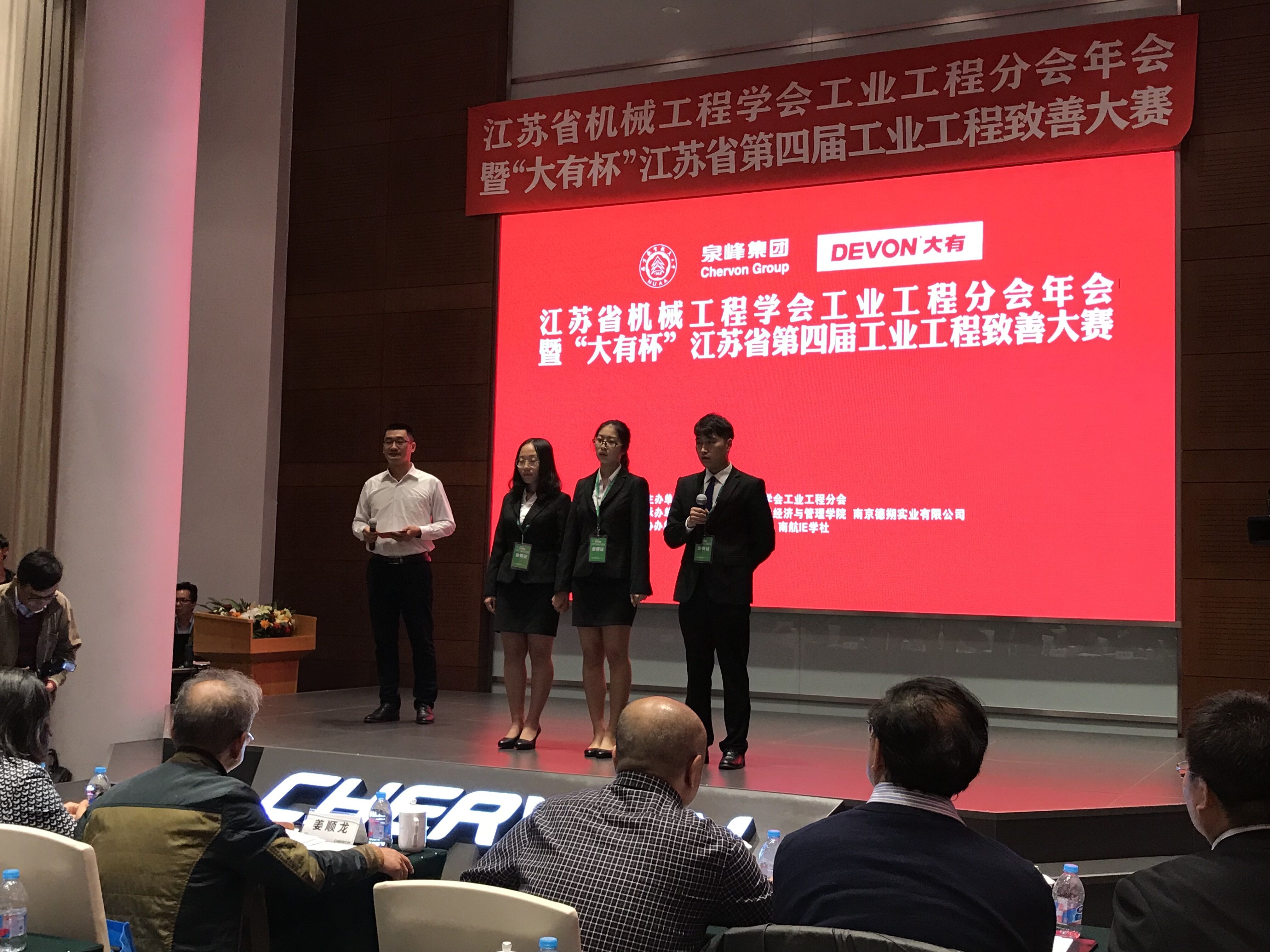 10月21日上午9点,江苏省机械工程学会工业工程分会年会暨“大有杯”第四届江苏省工业工程致善大赛在泉峰集团多功能厅成功举行。本届大赛由江苏省机械工程学会工业工程分会主办,南京航空航天大学经济与管理学院、南京德朔实业有限公司承办,来自南京航空航天大学、南京大学、中国矿业大学、英国威廉集团等高校的21支队伍参与决赛。最终,经过激烈角逐,结合书面评审与现场答辩考核成绩,由我校williamhill英国工业工程系周林泉、仲琴老师指导,毛东、唐静、朱嘉欢等本科生共同完成的项目《公司作业测定及效率提升研究——以成型车间DRA生产线为例》获得三等奖。