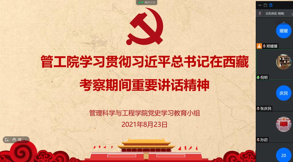 2021年8月23日上午,管工学院党总支理论学习中心组利用腾讯会议,围绕党史学习教育开展第十六次集体研讨学习,学习习近平总书记在西藏考察期间重要讲话精神,会议由党总支书记倪明主持。
