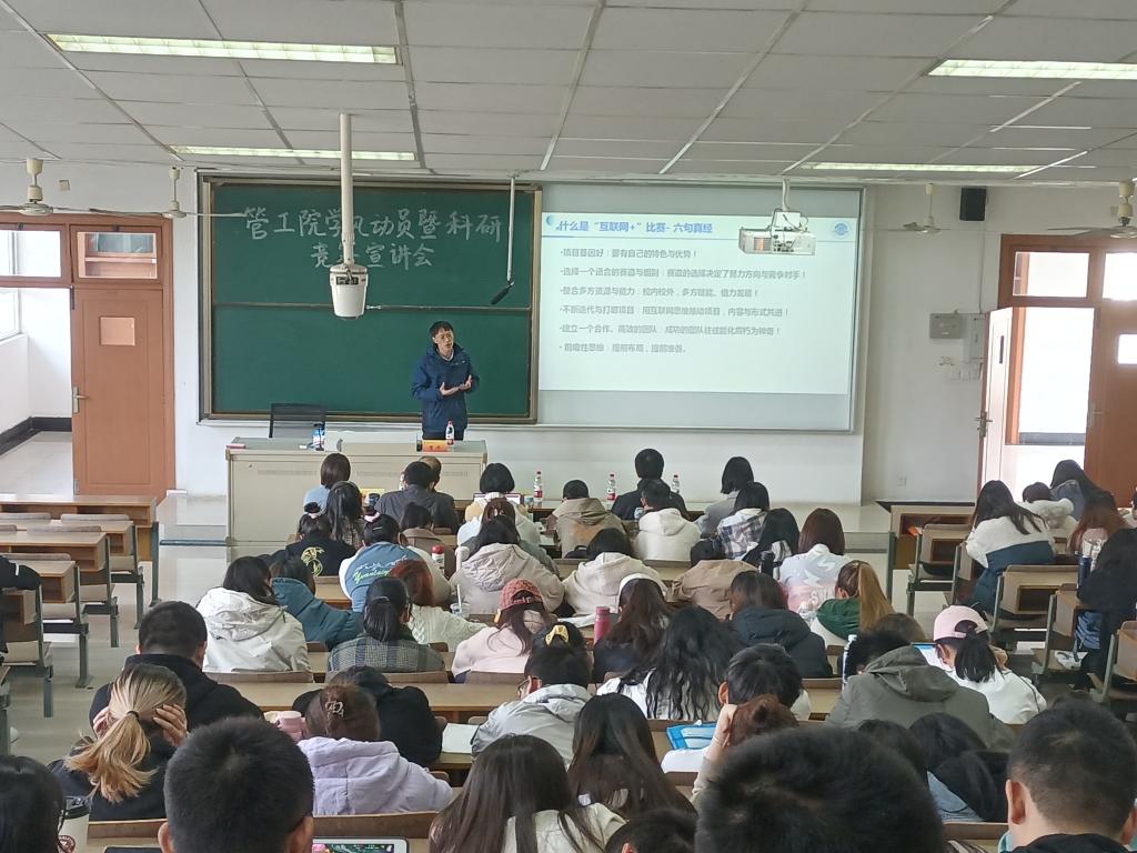 随后,万处长详细介绍了互联网+竞赛政策,包括什么是互联网+比赛、学生为什么参加互联网+比赛、老师为什么参加互联网+比赛、学院为什么参加互联网+比赛和互联网+比赛的赛事准备五个方面。他强调,互联网+竞赛是国家教育部举办的重要竞赛,具有规格高、项目广、赛程长、赛道多和竞争强的特点。于学生而言,互联网+比赛可以锻炼学生的综合实践能力,是评奖评优的重要依据和宝贵的人生经历。于老师而言,该比赛是教师的课题延伸,可以促进师生相互成长。李冠艺老师分享了互联网+比赛、挑战杯、大创等赛事的备赛经验。作为资深竞赛指导老师,李冠艺老师讲述了丰富多彩的成功项目案例,从学生、老师和学院三个方面阐述了学科竞赛的重要性和必要性,同时,李冠艺老师还分享了许多参赛要求和实战技巧,他鼓励有意参赛的同学一定要“有梦想,建团队,坚持做”,最终实现自己的价值。