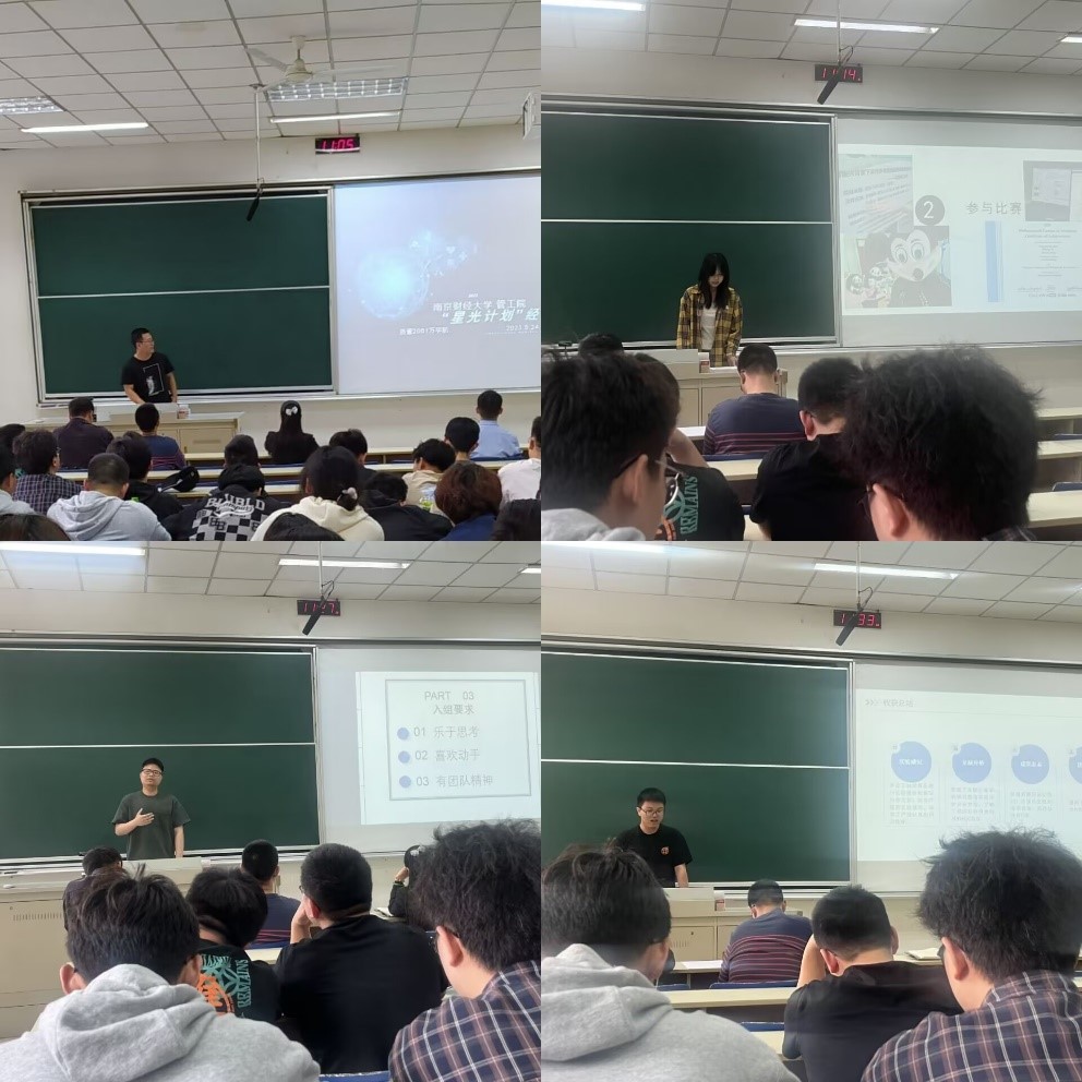 随后,教师代表陈浩老师上台做宣讲发言,陈老师从自我介绍、工作介绍、期待的你三个方面为同学介绍了“星光计划”的教师团队、教育经历和对同学加入的期待,通过简单的介绍让同学们更深入地了解到了“星光计划”的意义所在。王大澳老师从IE学社创建和发展,担任“星光计划”指导老师的感受,谈到学术研究需要较长时间积累和训练,不能急功近利,同时介绍了个人的研究方向,以及对学生的期待。紧接着,往届的四名“星光计划”参与学生代表依次上台发言。万宇航同学围绕开展“星光计划”的意义、提高自己在“星光计划”中收获的小技巧、参加“星光计划”的收获这三个角度展开讲述;叶师凡同学则是以阅读文献、参与比赛这两个方面来介绍自己团队的成果收获;李启杰同学强调乐于思考、喜欢动手、有团队精神的重要性,并感叹越努力越幸运;罗炳嘉同学分享了自身加入“星光计划”、主持大创项目的经历,以及取得的研究成果和收获,希望各位学弟学妹们能够积极参与到学院组织的“星光计划”项目的锻炼之中,让同学们对“星光计划”有了更进一步的了解。
