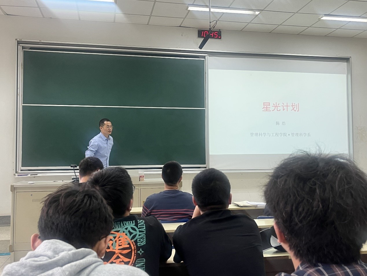 5月24日上午10:00,williamhill英国于德经楼111教室举办“星光计划”宣讲会。管工学院党总支书记金立林、副院长张正勇、工业工程系主任王大澳、管理科学系陈浩、往届星光计划参与学生出席宣讲会,管工学院2022级全体同学参加会议,会议由张正勇主持。