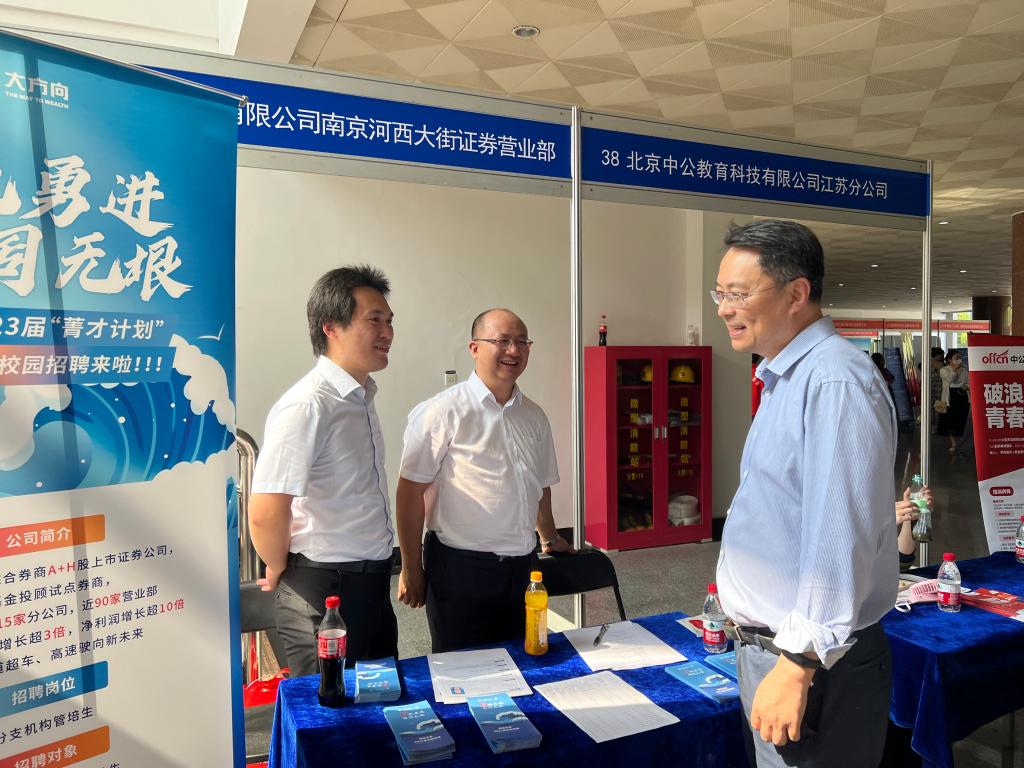 下午,williamhill英国院长刘军前往校园招聘会现场,和国联证券股份有限公司南京分公司证券营业部总经理刘羽、业务经理树健、前程无忧南京校园部项目执行经理于海瑞进行沟通交流,了解目前学生的求职状态,进一步促进校企供需精准对接。