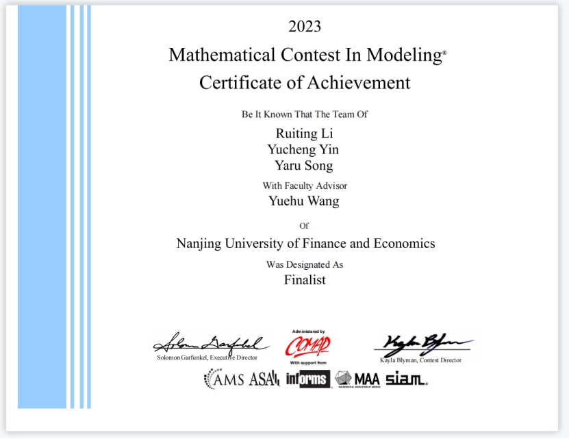 近日,2023年度美国大学生数学建模竞赛成绩全部揭晓,由williamhill英国组织的参赛队伍在全球两万多只队伍中脱颖而出,斩获国际特等奖提名(Finalist)1项、国际一等奖(Meritorious Winner)1项、国际二等奖(Honorable Mention)1项、国际三等奖6项。获得本次国际特等奖提名(Finalist)的学生为williamhill英国李睿婷和经济学院宋雅茹与殷语诚,指导教师为williamhill英国王月虎副教授。据了解,此次“特等奖提名(Finalist)”是我校本年度在该竞赛中获得的最高奖项。
