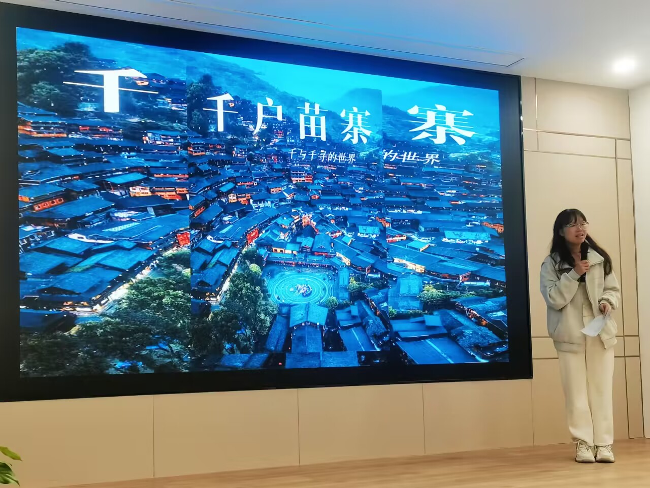 侗族的袁菡同学来自黔东南苗族侗族自治州,她以幻灯片播放的形式展示了家乡的美景与文化,其中的侗族大歌被列入了“非物质文化遗产”,肇兴侗寨更是作为过春晚的分会场,木质吊脚楼与特色银饰也是侗族最好的名片。黔北的向晔同学虽然是苗族,但因为生长环境与仡佬族文化密不可分,因此向我们分享了仡佬族的相关传统,因为那里漫山遍野都是茶,所以在仡佬族沿袭千年的饮食习俗“三幺台”中,三台席依次为茶席、酒席和饭席。他也提示大家,由于特殊的喀斯特地貌,所以“山路十八弯”的地形非常考验驾驶技术。