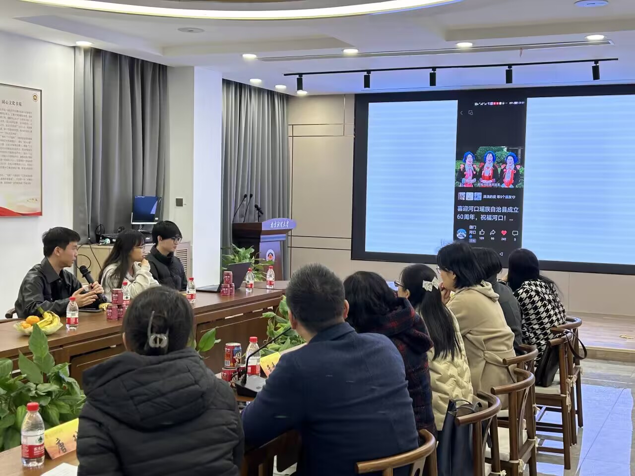 李金霖同学和陆睿智同学都来自云南,李金霖是成长在楚雄彝族自治州的傈僳族同学,他向我们分享了彝族的盛大节日——火把节,彝族地区素有“火之故乡”的美誉,李金霖同学分享道:“火把节当天,家家户户都来到约定俗成的场地,围着火堆一起唱歌跳舞”。陆睿智同学长于河口瑶族自治县,那里与越南仅一河之隔。陆睿智同学讲解道:“与大家刻版印象中边境地区的情况恰恰相反,我们那里不仅十分安全,而且在政府的鼓励下,不少居民还能通过边贸往来不断改善家庭情况”。此外,在喜迎河口瑶族自治县成立60周年的宣传视频中,陆睿智同学的妈妈也身着瑶族特色服饰,为家乡献上了祝福。