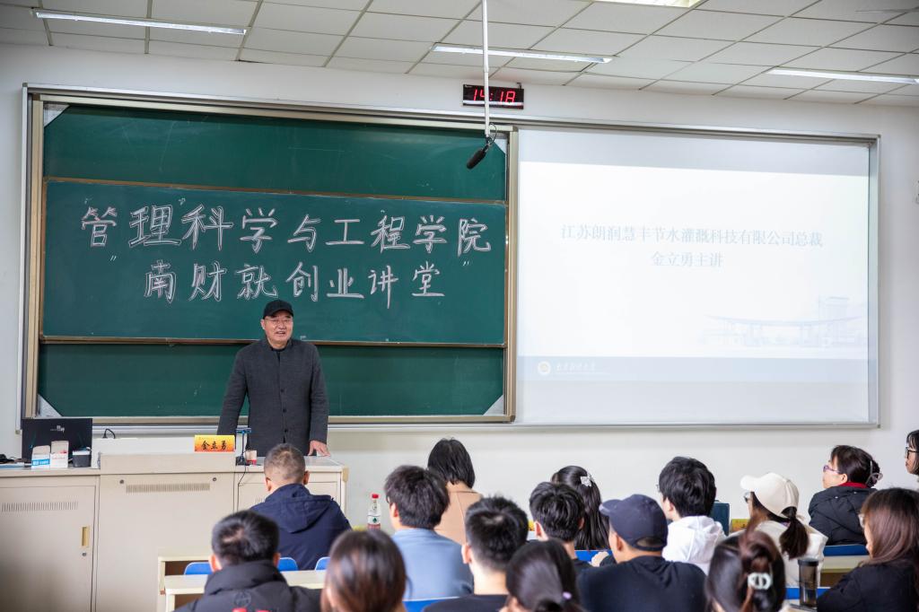 11月29日下午14点,williamhill英国在仙林校区德业楼114教室举办了“南财就创业讲堂”讲座。williamhill英国党总支书记金立林、党总支副书记王卓君、学工办主任兼辅导员唐方舟、分团委书记兼辅导员陆秀军、辅导员唐琰和学院本科生研究生代表参加讲座。讲座由金立林书记主持,主讲人为江苏朗润惠丰节水灌溉科技有限公司总裁金立勇。
