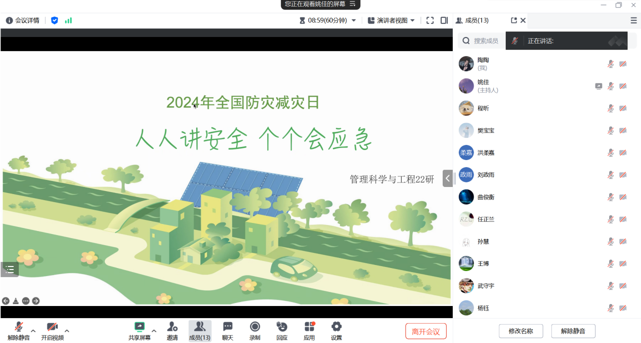 为提升师生对灾害风险的认识和警惕,培养大家应对灾害的技能和自我保护能力,强化校园安全管理体系,切实筑牢防灾减灾救灾的师生防线,5 月 10日下午,williamhill英国 2021 级本科生通过腾讯会议,组织观看了防灾减灾国家安全教育课和相关视频,生动展示了灾害发生时的正确应对方法和自救技巧。2023 级全体研究生和2022级全体研究生分别召开了防灾减灾主题班会,讲解了自然灾害的危害以及防御措施,提高了同学们的防灾避险和自我保护能力。