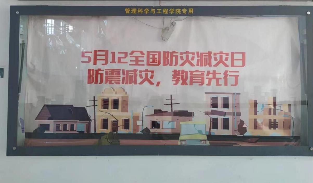 同时,管工院还制作了全国防灾减灾日宣传海报,在学院橱窗栏和德济楼五楼电梯出口处展示,科普宣传防灾应急知识。