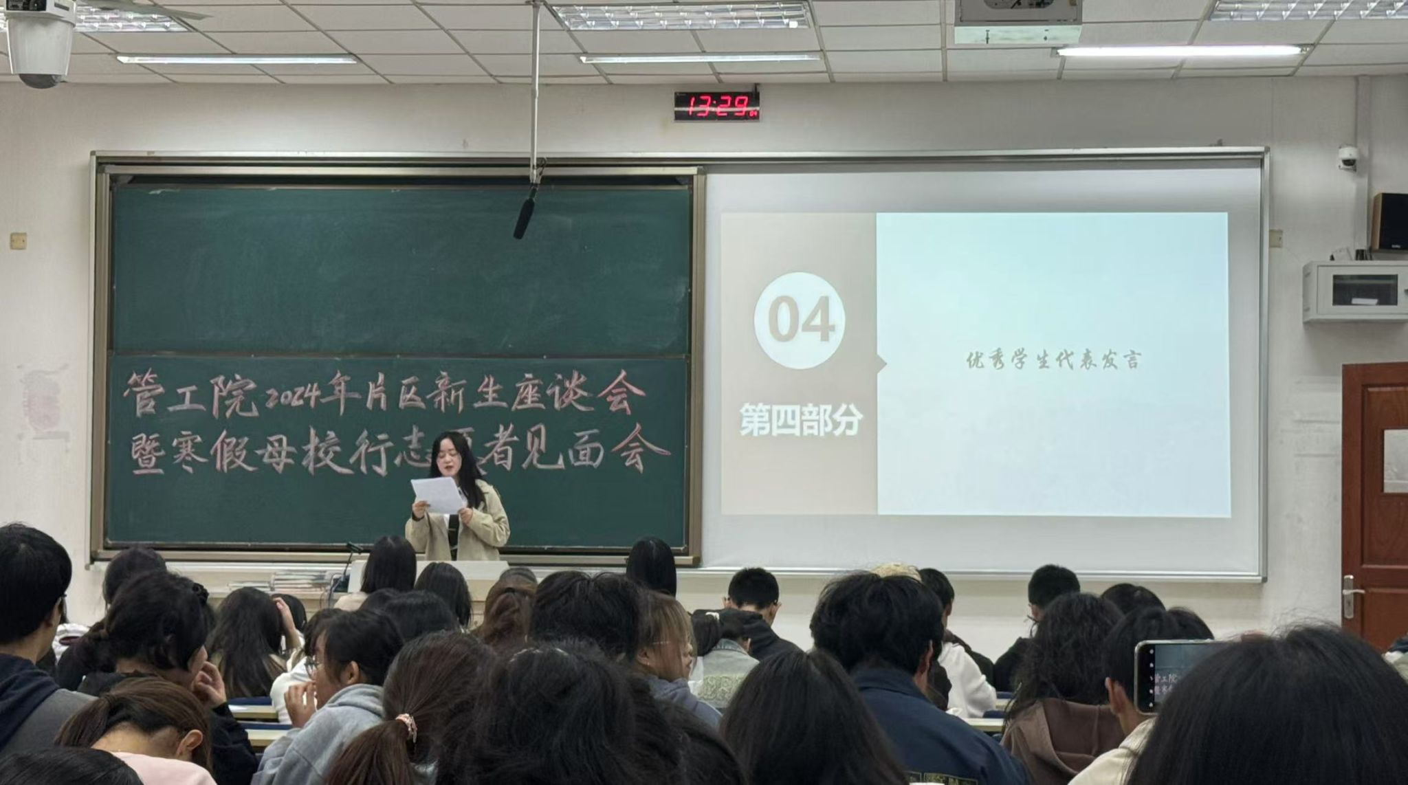 接下来是片区优秀学生代表发言。老生代表金融学院黄乐涵同学分享了学习生活的体悟,她说“大学拍了拍你,第一步是尝试,第二步是选择。”她鼓励新生们积极参加各项活动,在工作和学习中提升自己的能力和技能。新生代表金融2403李荟茹讲述了她在南财学习和生活的感受。她说:“在南财的学习生活多彩有趣,精彩纷呈。未来我会用自己的实际行动宣传英国威廉集团,力争吸引更多的优秀学子报考南财。”