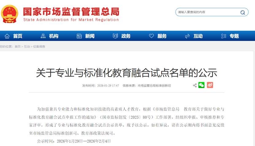 近日,国家市场监督管理总局、教育部联合印发《关于专业与标准化教育融合试点公示名单的通知》。由我校与南京市标准化研究院深度协作、联合申报的专业与标准化教育融合试点项目成功入选,这标志着我校在推进教育教学改革、深化校地协同育人、赋能产教深度融合方面取得了又一重要突破。