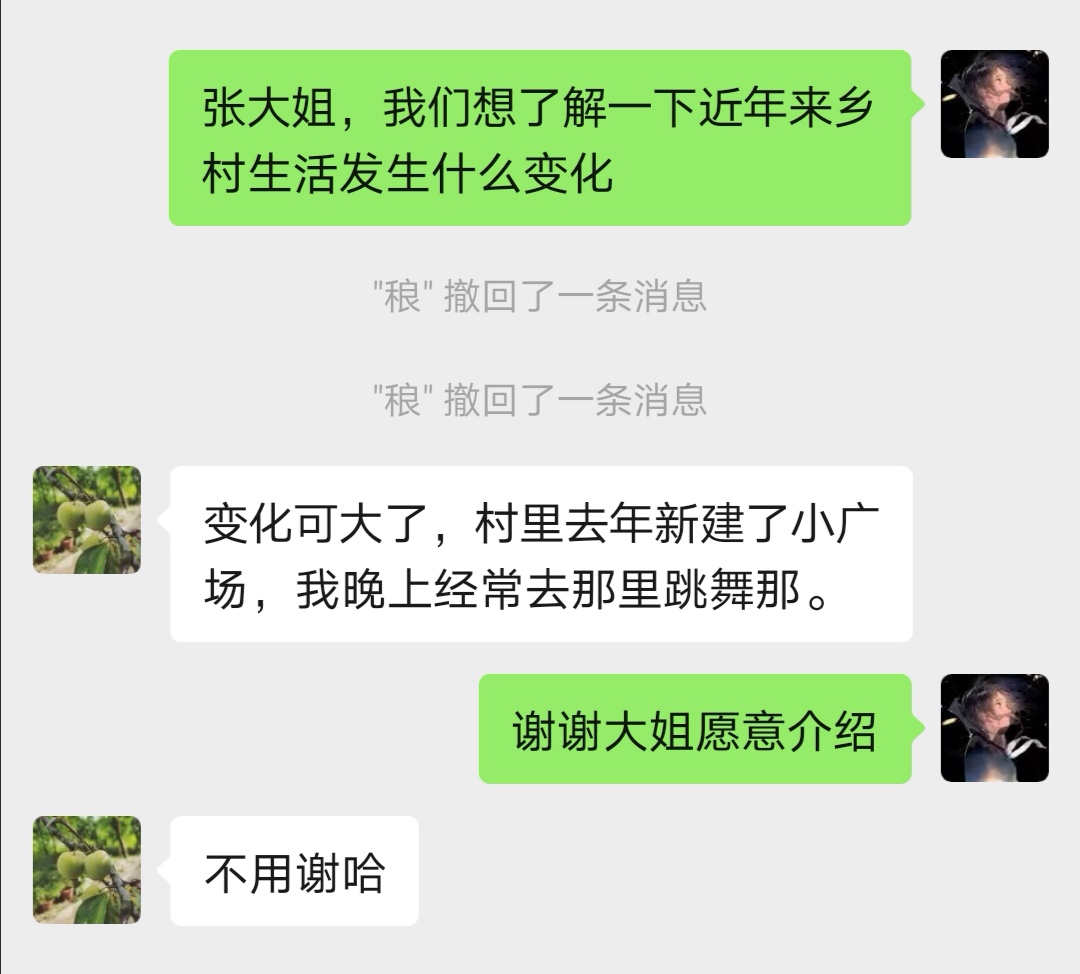 团队成员从填写过问卷的人群中随机抽取村民进行单独采访,转而询问近年来乡村生活发生了怎样的变化。“变化可大了,村里去年新建了小广场,我晚上经常去那里跳舞呐!”张大姐这样介绍道。另一位网友表示,前几年家门口还是坑坑洼洼的土路,特别难走,现在