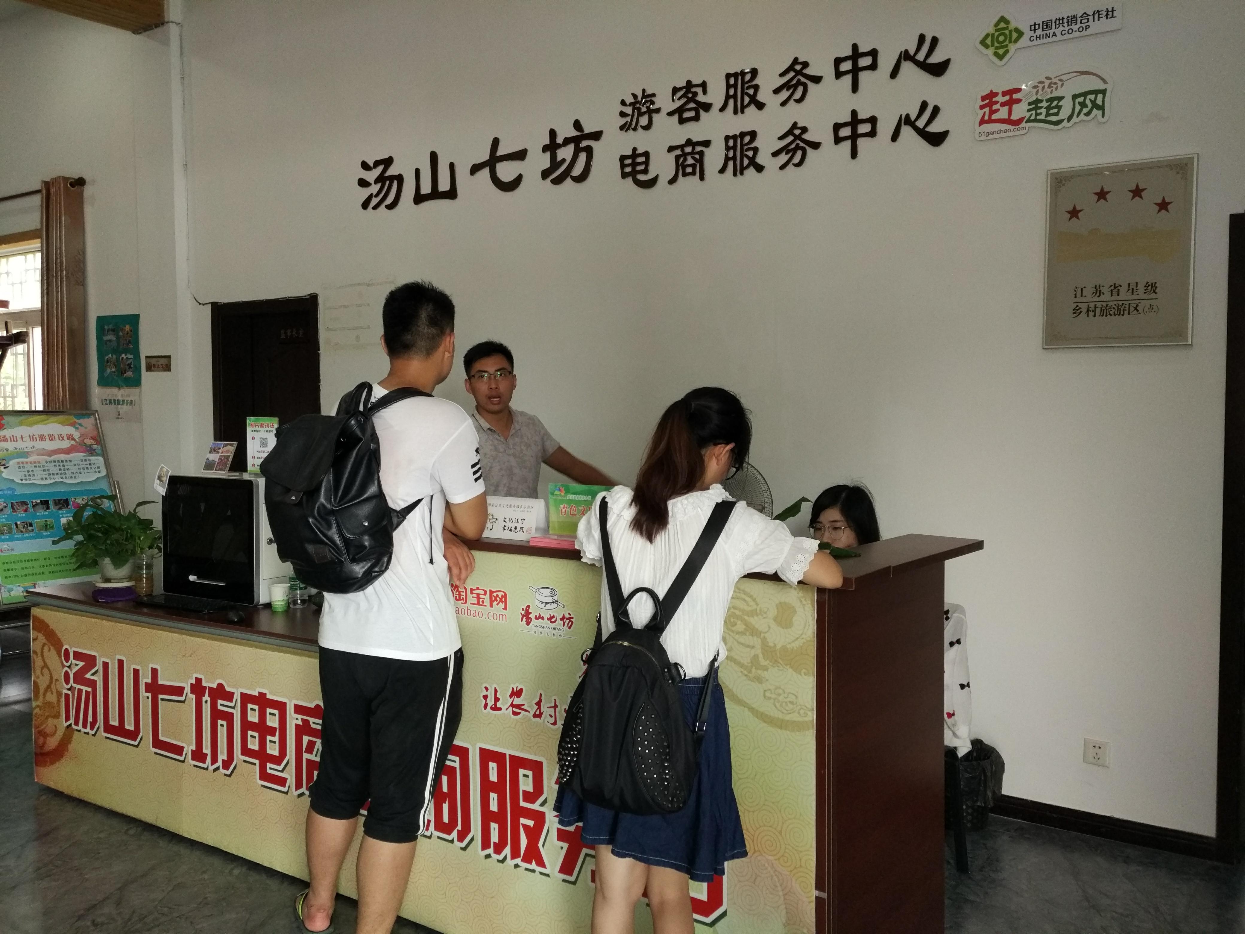 在游客中心的门口和室内,十分醒目的“电商”、“赶超网”、“淘宝网”等字眼,引起了队员们极大的好奇。据了解,汤山七坊的电商主要是社区搭建的平台,为当地农产品服务的。社区不仅为村民的农产品增加了销售渠道,还会给村民进行电商的专业培训,让他们懂知识、会销售、提收入。在汤山七坊旅游得到发展的同时,村民们提高了收入改善了生活。