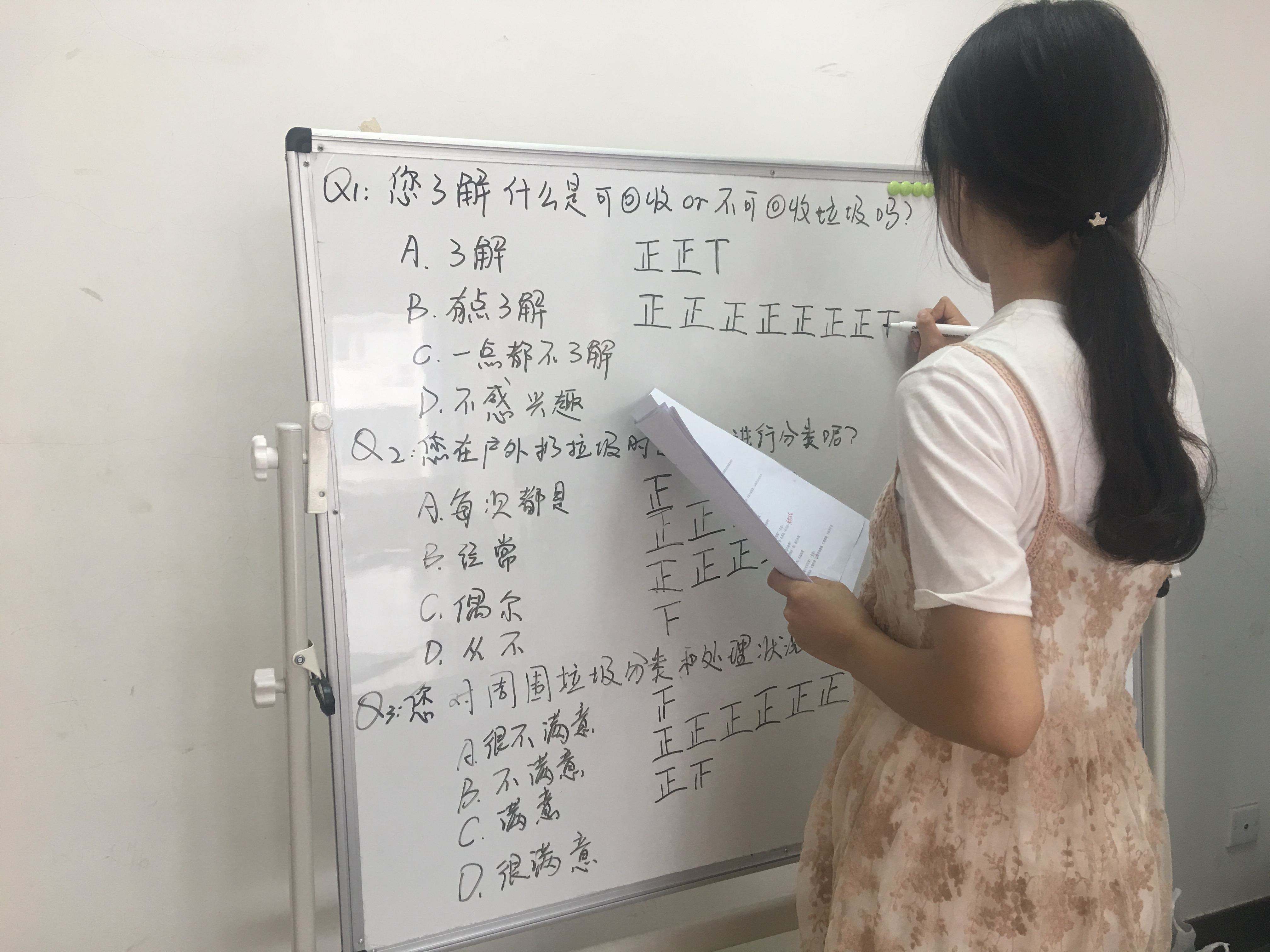 首先,队员们从把随机抽取的50份调查问卷的每项内容都列下来,采取画正字的方法统计了有关数据。以便从得到的数据中了解到公民对垃圾分类的态度,对垃圾分类的现状有了进一步的了解。随后,小分队队长在白板上列出了垃圾分类目前存在的各项问题及产生这些问题的各种原因所占的比例。经过激烈的讨论后,小分队成员们总结得出最终结论:虽然不少居民都有着环保意识,但是他们中对于如何分类垃圾依然存在很多疑问。尤其是一些老年人在这一方面了解不多,直接导致了垃圾分类不到位。同时社区和街道的设备还不够完善,没有办法有效进行垃圾分类。