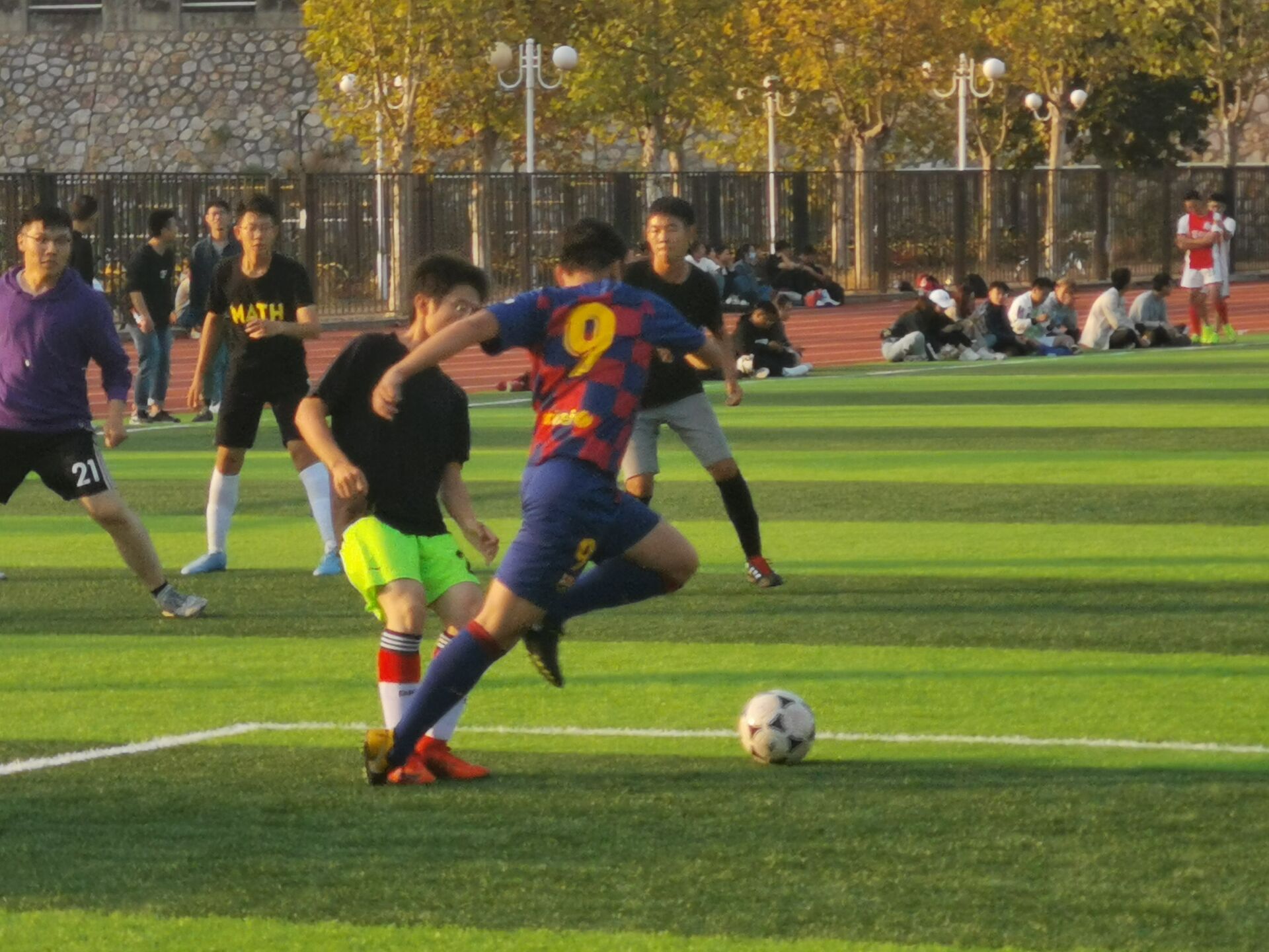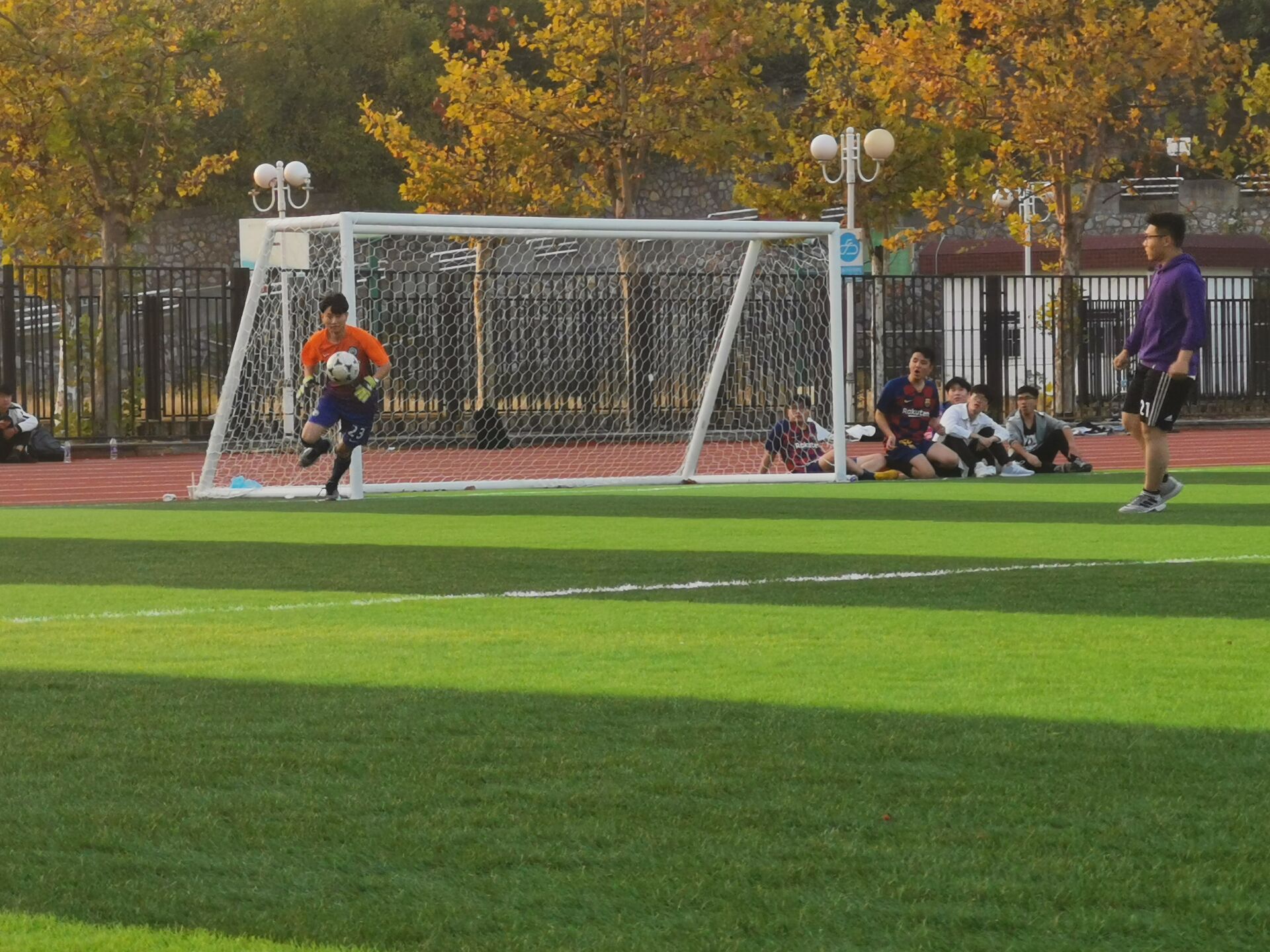 片刻休息后,双方球员重返赛场,进行了激烈的下半场球赛。管工财税联队的进攻较上半场比赛更为猛烈,在上半场时未赢得比分似乎激发了球员们心中的强烈胜负欲,他们愈发顽强拼搏。但开场约10分钟,管工财税联队一球员被应数艺设联队球员踢到大腿,所幸并未受伤,但这意外伤害却使管工财税联队更加斗志昂扬。终于在下半场的中旬,9号牛宇霆旗开得胜,越过应数艺设联队球员的阻拦,率先踢进一球。这一振奋人心的进球,使管工财税联队的球员们信心大增,乘胜追击。不到十分钟,8号球员金鑫便再进一球,赢得了全场的欢呼声。在接下来的比赛中,两队球员你追我赶,个个都生龙活虎、拼尽全力。最终,在比赛接近尾声之际,管工财税联队8号球员金鑫又进一球,为此次比赛画上圆满的句号。