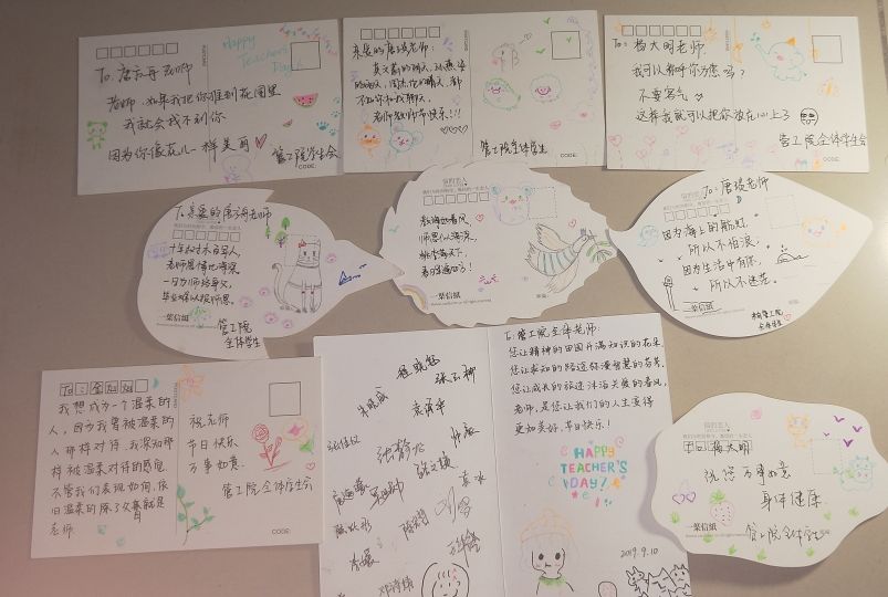 近日,学生会成员在全院范围内进行“情书”征集,同学们踊跃参与,纷纷在卡片上写下土味情话,并绘制了萌萌哒彩色小图画,还勇敢写下其“表白”老师的名字。9月10日,学生会成员将收集的手绘“情书”当面送给老师。情书上可爱的大白在比心,俏皮的流氓兔扭动着腰肢,多啦A梦正吃着铜锣烧、憨态可掬的熊猫宝宝张开怀抱,撑开的小伞洒落着雨珠、还有一棵棵绿树、一朵朵小花、一株株小草、一条条藤蔓、一串串脚印……图画边上写着“老师,如果我把您推到花园里,我就找不到您了,因为您像花儿一样美丽!”、“莫文蔚的阴天,孙燕姿的雨天,周杰伦的晴天,都不如我和你聊天”、“山高水长有时尽,唯念师恩日月长”、“人生如梦,是您为我们播种梦的种子。让我们的梦生根、发芽。我爱您,老师!人生旅程上您为我点燃希望的光芒,丰富我的心灵增添我的智慧谢谢您!老师”、“你的心是温柔的宇宙,把关爱播撒;你的眼是温暖的明灯,把前途照亮;你的手是智慧的海洋,把知识书写。你的人生是无悔的格言,把责任担起。老师,愿你节日快乐”……