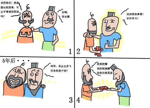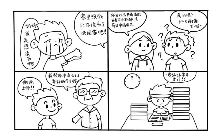 活动伊始,贴在展板上的七幅四格小漫画活泼有趣、生动可爱,吸引了不少同学驻足欣赏。有的画的是曾接受国家资助的学子成长成才后回报母校和国家的感人故事;有的漫画旨在引导同学们诚信申请并使用助学金,不奢侈消费;还有的画讲述的是学生在国家资助下努力学习砥砺奋斗的故事。工作人员邀请同学们为自己喜欢的漫画加盖小印章进行投票。不一会儿,漫画上就盖满了章。