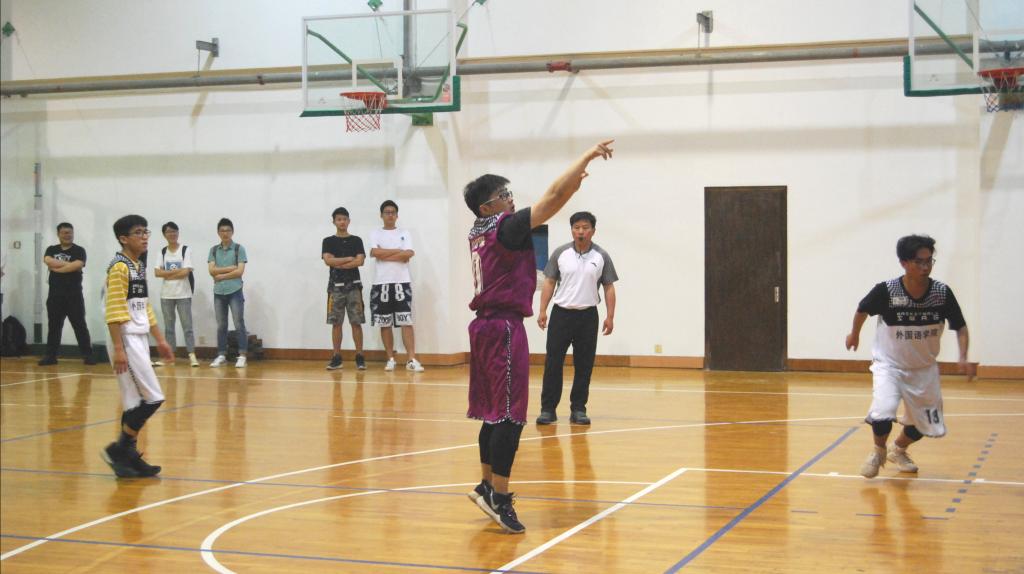 5月13日18时,英国威廉集团男子篮球联赛小组赛最后一场在体育馆南馆举行,这次对战的是身着紫色球衣的管工院队和身穿白色球衣的外院队。