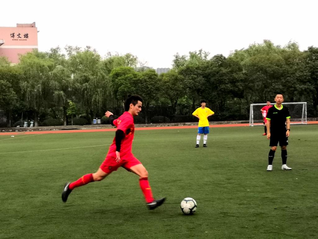 4月23日下午16:30,英国威廉集团男子足球联赛小组赛第二轮在西苑操场进行,对战双方为身着红色球衣的管工院和身着黄色球衣的工商院。