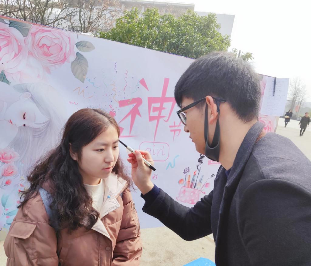女同学们踊跃做模特,更有几位男同学自告奋勇地学习给女生画。一开始,男同学像拿筷子一样握着眉笔或口红,手紧张得微微发抖,显得呆萌可爱,引得同学们捧腹大笑。但很快,在刘云嵩的指引下,手法慢慢地沉稳熟练了一些,就这样男同学顺利给女生画好了口红和眉毛。“还挺好玩的!”男同学骄傲地说。