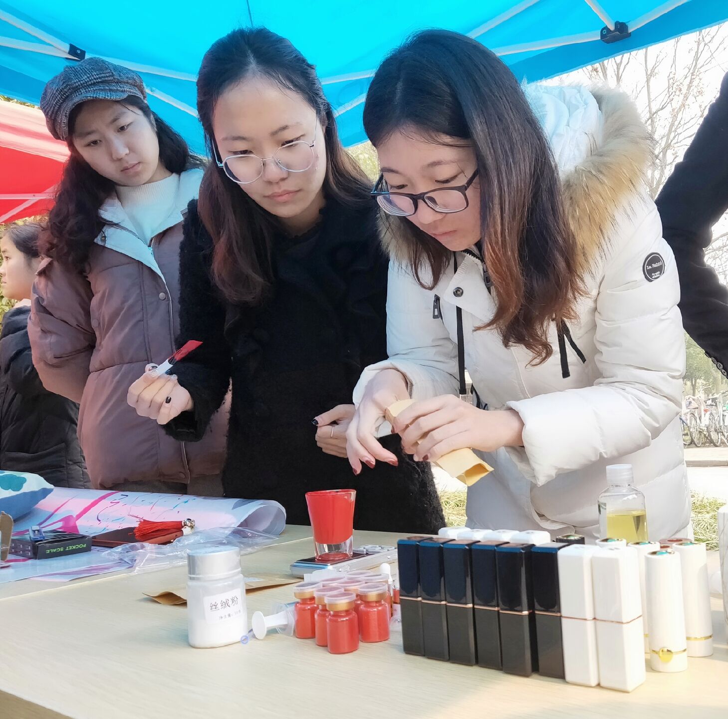 活动现场,桌子上各种颜色的瓶瓶罐罐引起路过学生的兴趣,“这是在干嘛?”同学们充满了好奇。当得知是亲手制作口红,教画口红画眉时,同学们都很震惊,“这么厉害的嘛!”。于是便兴致勃勃地学起来了。