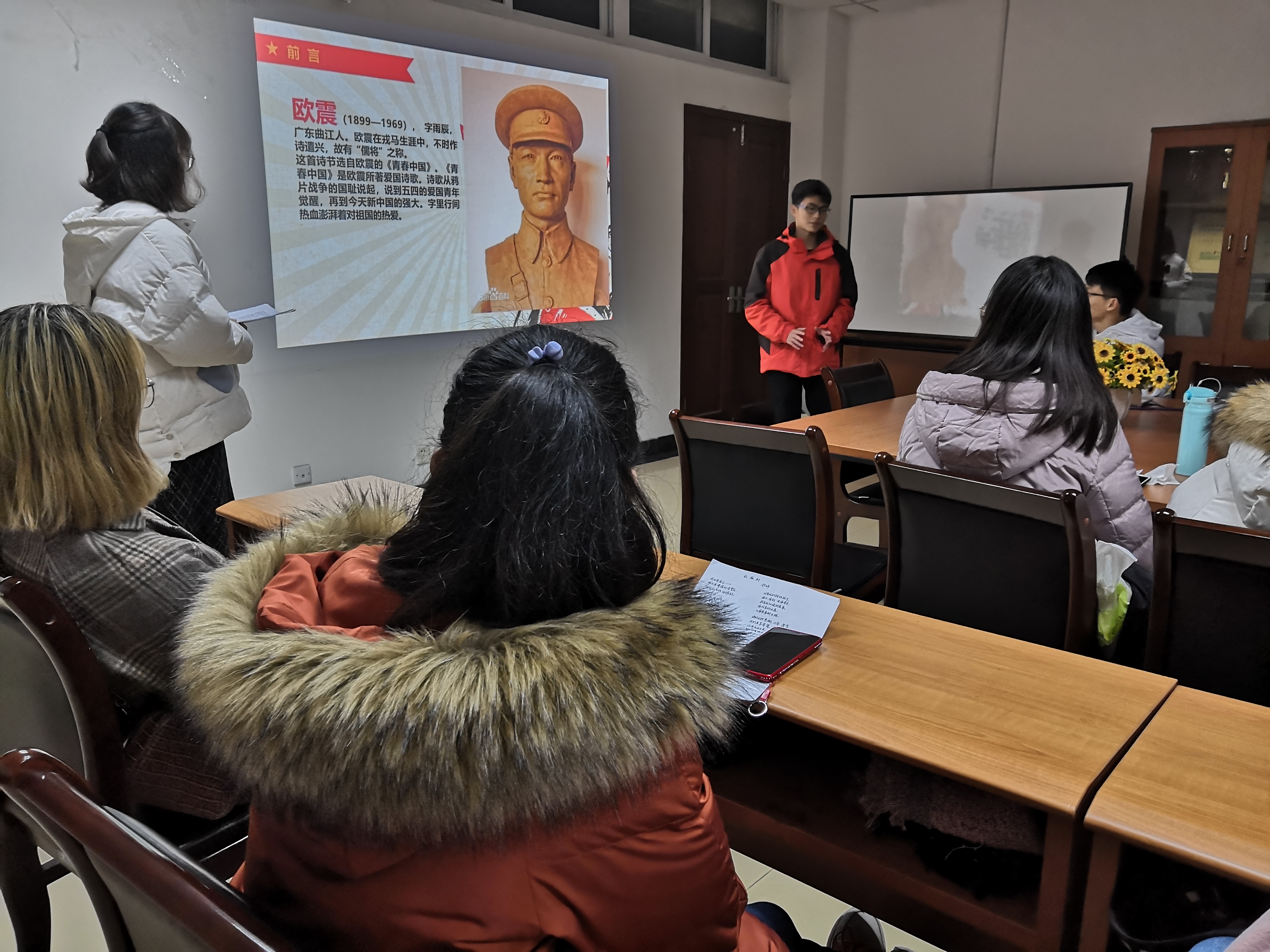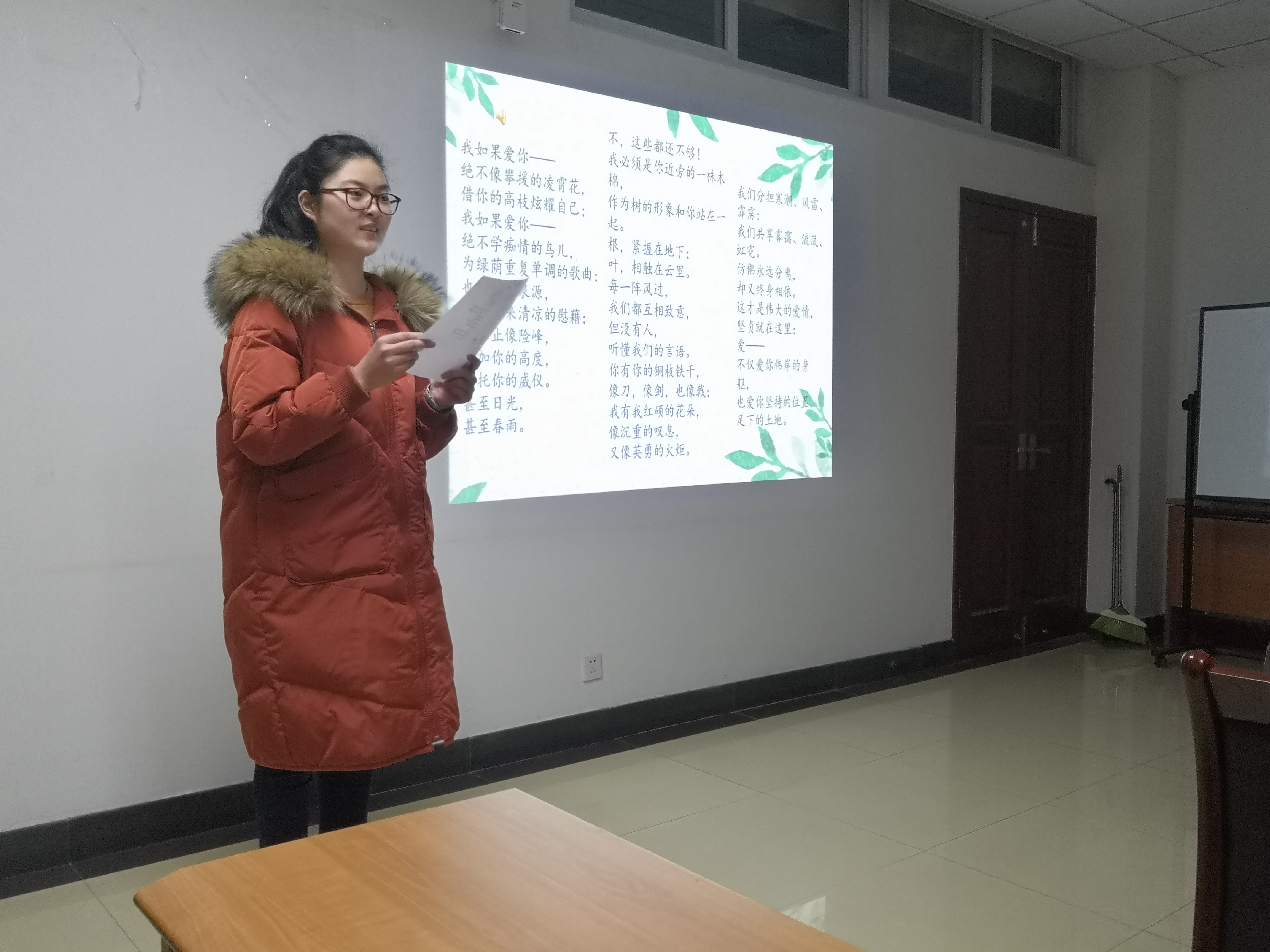 活动开始,各小组的两名代表按顺序上台,一人朗诵诗歌,一人分享诗歌感想。同学们先后朗诵分享了艾青的《我爱这土地》、董卿的《故乡》、舒婷的《祖国啊 我亲爱的祖国》、梁启超的《少年中国说》、舒婷的《致橡树》和欧震的《青春中国》六首优美且具有正能量的诗歌。朗诵时,同学们们吐字清晰,断句清楚,抑扬顿挫,声情并茂;谈及感受体会时,同学们们抓住诗歌的内涵和精神进行了深度剖析,畅谈体会和心得。孙奥同学颇为动情地说,我特别喜欢《致橡树》这首诗,尤其是“我必须是你近旁的一株木棉,作为树的形象和你站在一起。根,紧握在地下;叶,相触在云里”这一句,爱情里面我们应该平等独立,势均力敌,不攀附不乞求,这样的爱才能长久”。袁泽华同学说,梁启超的《少年中国说》对我影响很大,诗中的“少年强则国强”放在今天仍然适用,十九大报告中的“青年兴则国兴,青年强则国强。青年一代有理想、有本领、有担当,国家就有前途,民族就有希望”和此一脉相承。”台下的同学认真聆听,仔细体会,不时会心点头。