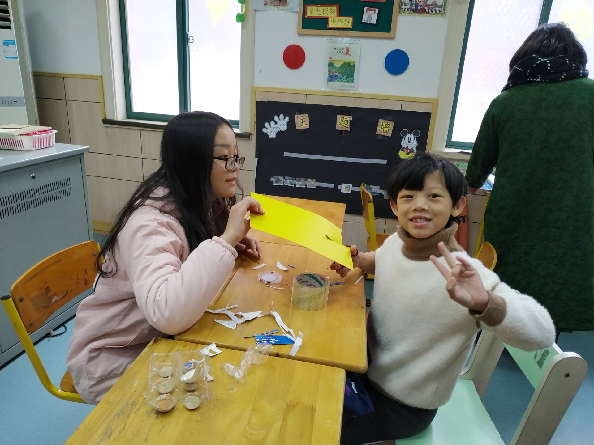 志愿者们拿出精心准备的手工制作材料,有牙膏盒、吸管、橡皮泥和瓶盖等等。孩子们看到这些小玩意,立刻蜂拥而来,把志愿者们团团围住。在老师的协助下,孩子们被分成几个小组,跟着志愿者们用这些材料学习制作小汽车。
