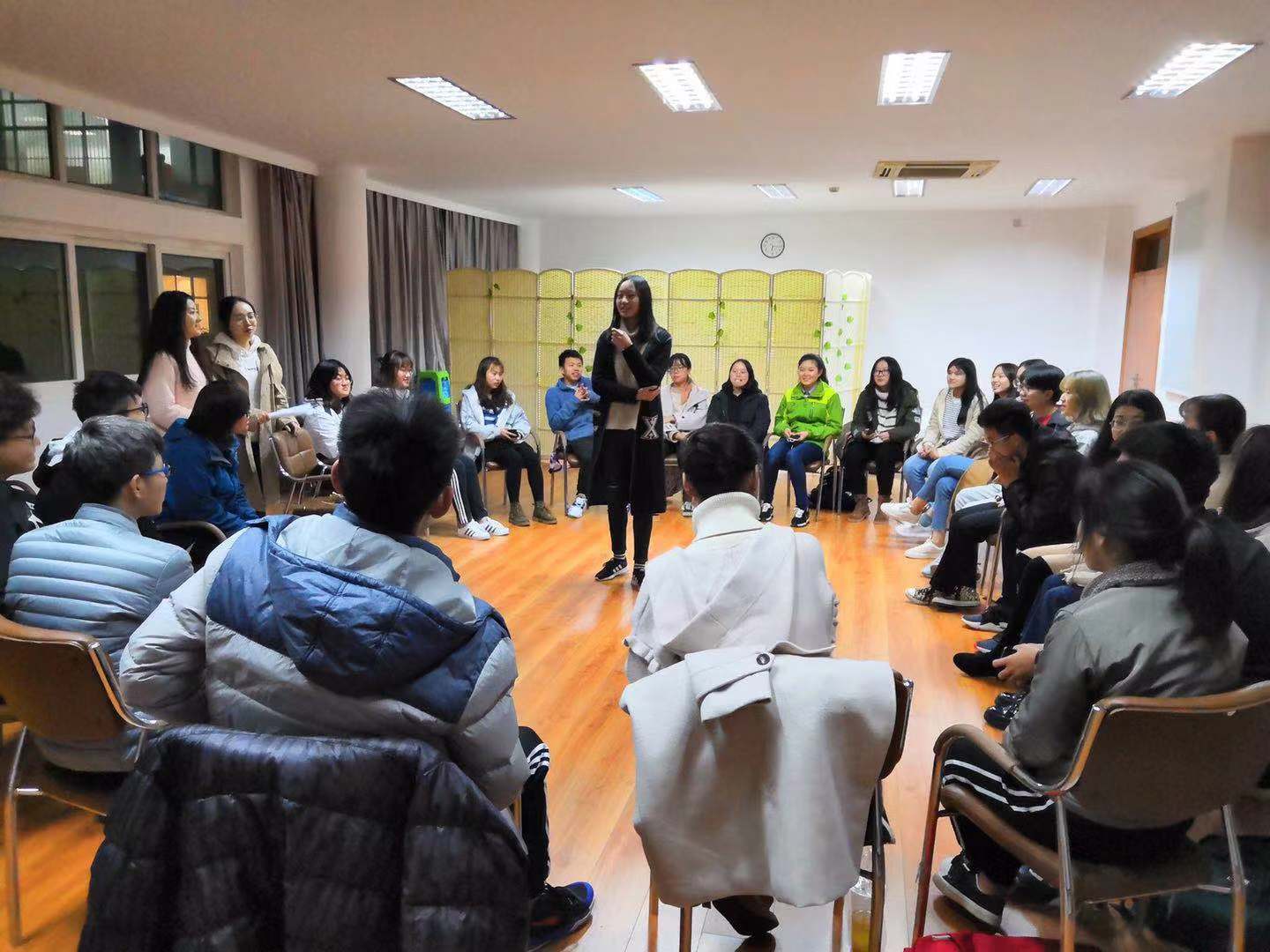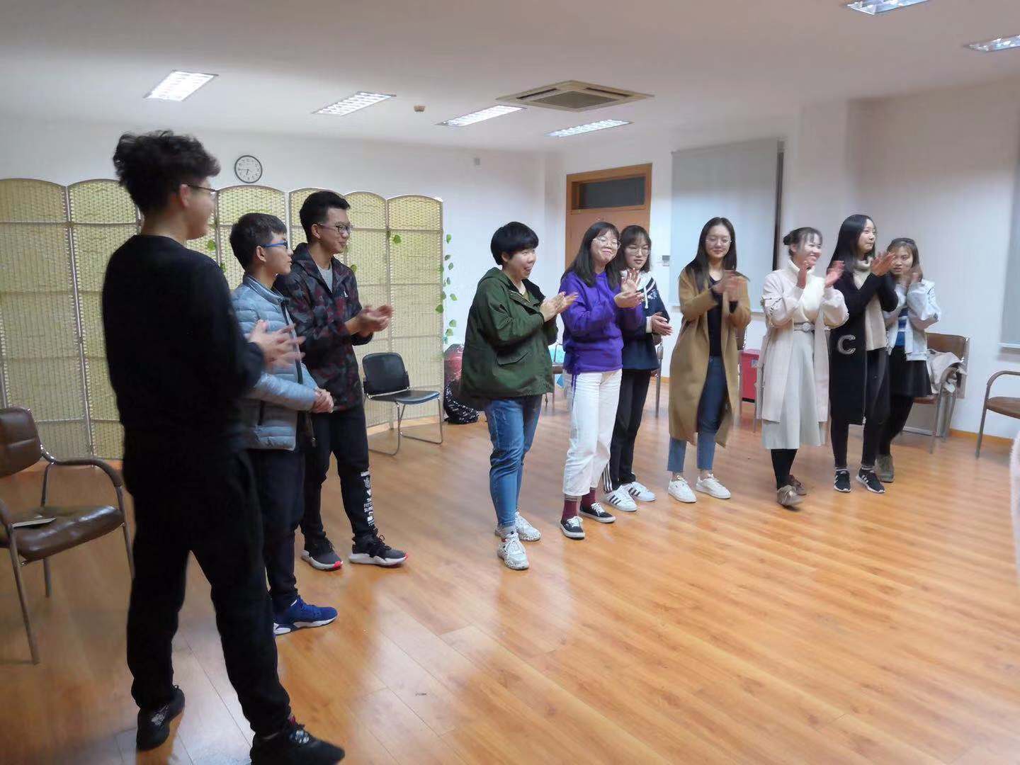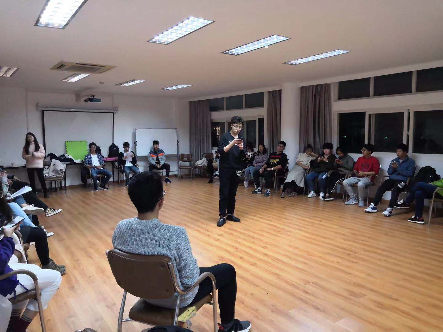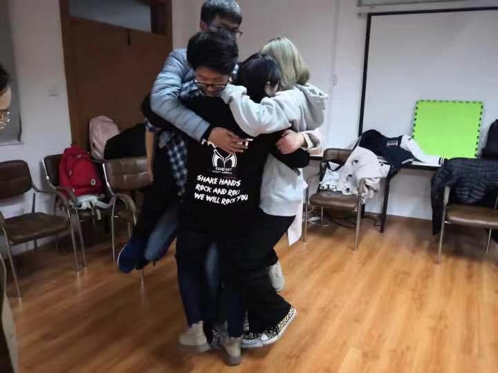 首先开始的游戏是“大风吹”。大家围成一个圈,同学们听到与自己相符的表述时立即离开原有座位并找空位坐下,没有找到座位的同学表演节目并主持下一轮游戏。同学们积极参与,灵活应对。接着,进行第二个游戏“叠罗汉”,尹耀平老师将成员分成三组,每人介绍自己的姓名和特点,下一个人重复直至结束,用时最长的小组需要表演一个节目。成员们聚精会神,全身心投入。然后,是第三个游戏“同舟共济”。同学们被分成五组,每组成员站在报纸上,最后报纸折叠次数最多的获胜。同学们小宇宙爆发,想出各种妙招,也引出许多笑料。最后,第四个游戏“信任后仰”,圈中人全身心放松,将后背交给其余组员并保持平衡。同学们放松下来,享受有人为你托底值得依靠的感觉。