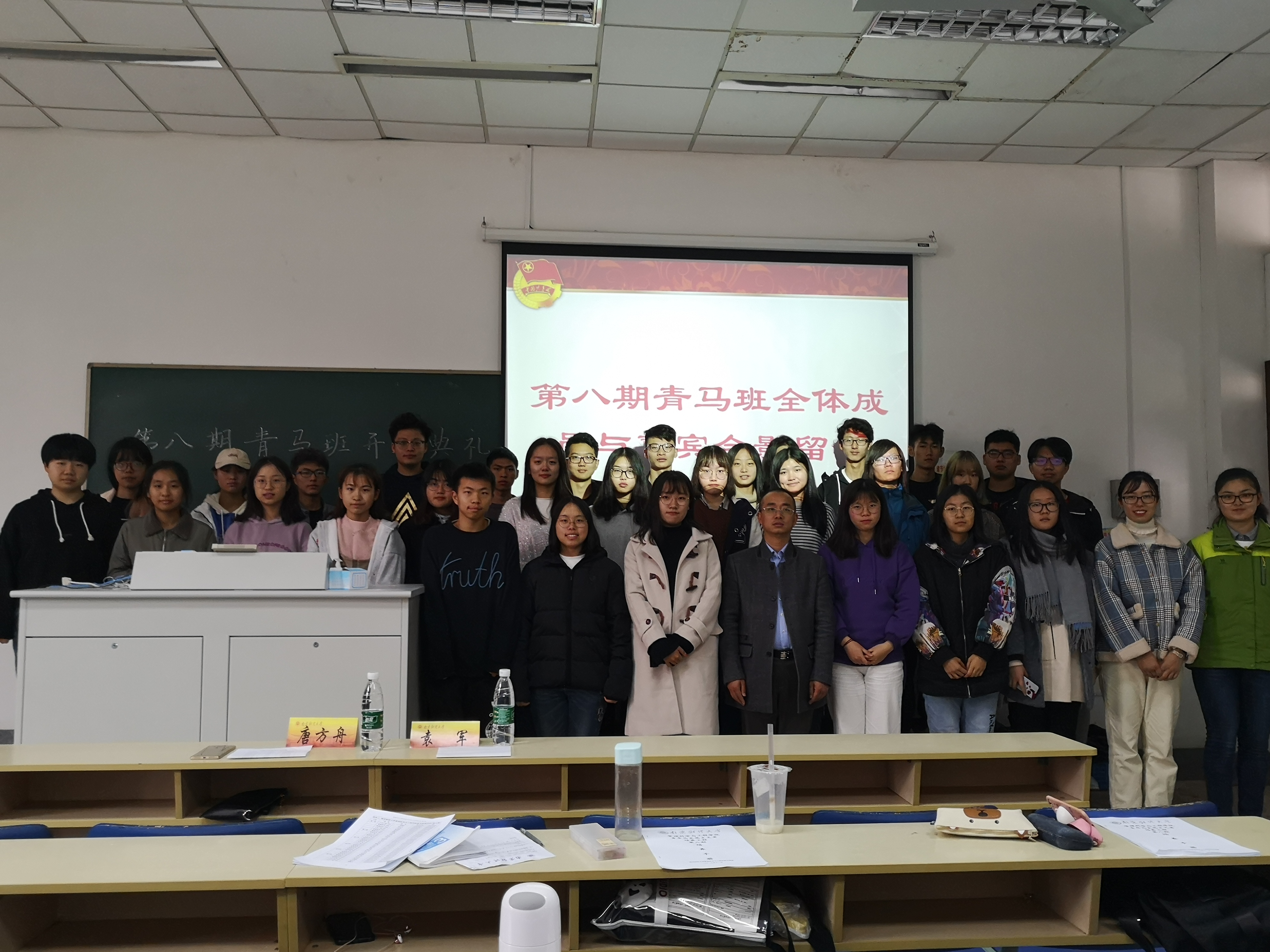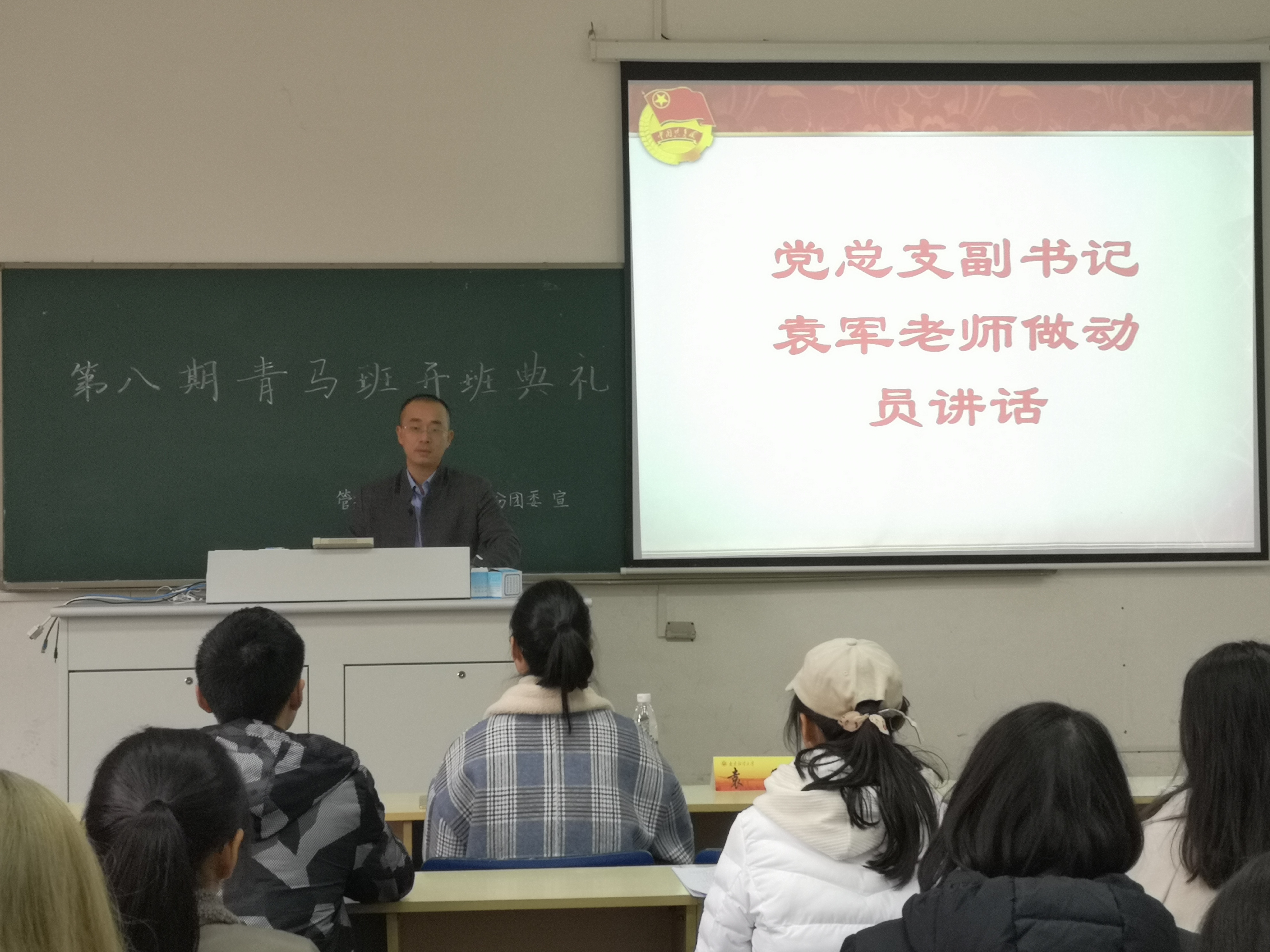 首先,学员们一起观看了精彩的视频,回顾了往期青马班丰富多彩的活动,重温了中国共产党十九大报告。随后党总支副书记袁军做动员讲话,他讲述了对往期青马班的感受,并对新学员表示祝贺和欢迎,并对未来的学习提出明确的要求。接着,唐方舟老师宣读了第八期初级团校优秀学员的名单。紧接着第七期青马班优秀学员代表卞苏清发言,他分享了过去一年在青马班的学习心得,并鼓励新学员们认真学习,力争上游。随后第八期初级团校优秀学员代表尹金凤发言,她阐述了自己参加初级团校课程的感受和认识,并表示会努力学习,不断进取。同学们反响热烈,掌声不断。最后,全体学员起立,在团歌声中重温入团誓词。