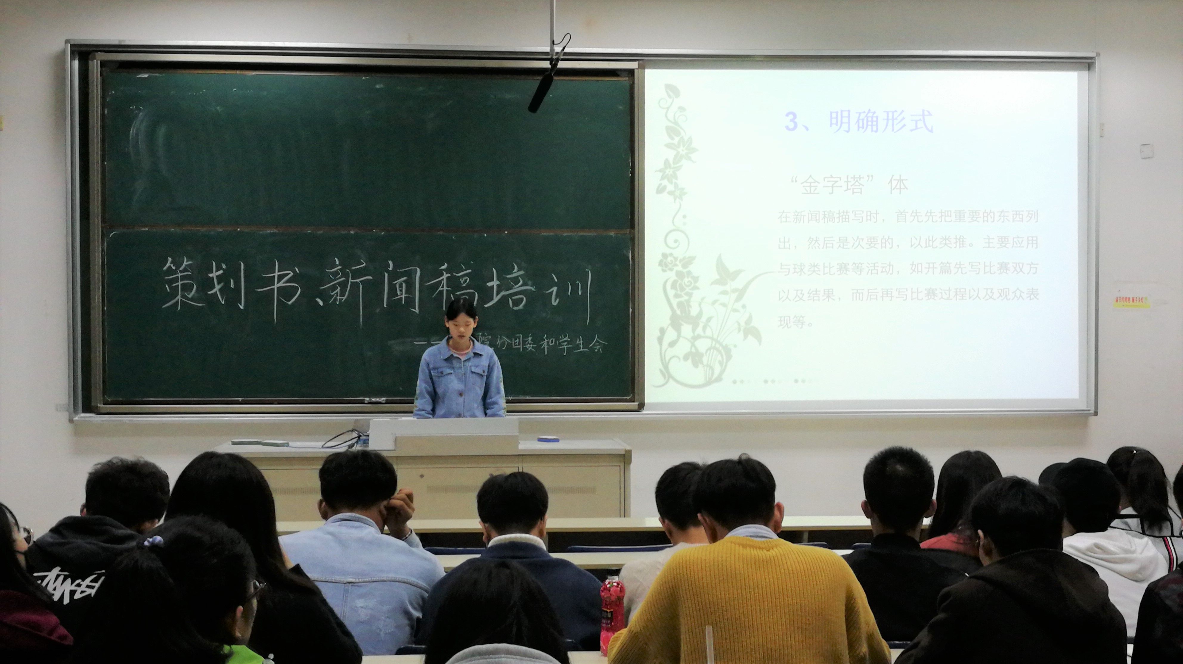 接着,分团委宣传委员王萱讲解新闻稿的写作。她从明确新闻稿角色、目的和形式三个方面开始,以新闻六要素为引导,注意事项为要求,深入浅出地讲解了新闻稿写作的各种细节。