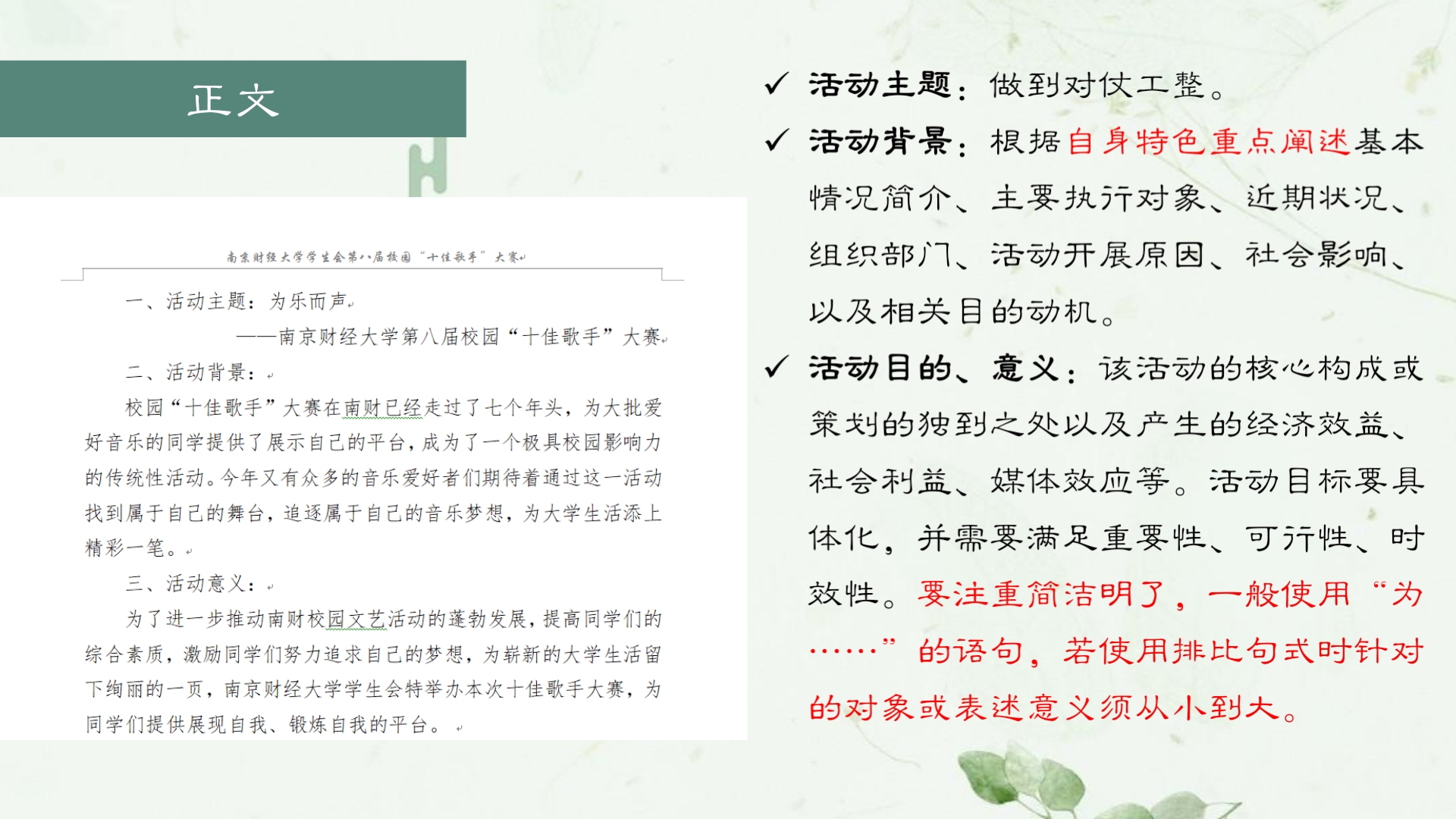 首先,校学生会秘书处副秘书长孙宁介绍策划书的书写。她从策划书的概念、写作准备、模板和注意事项四个方面入手,逐步延伸,详细地阐述了策划书写作的主要内容及规范性。