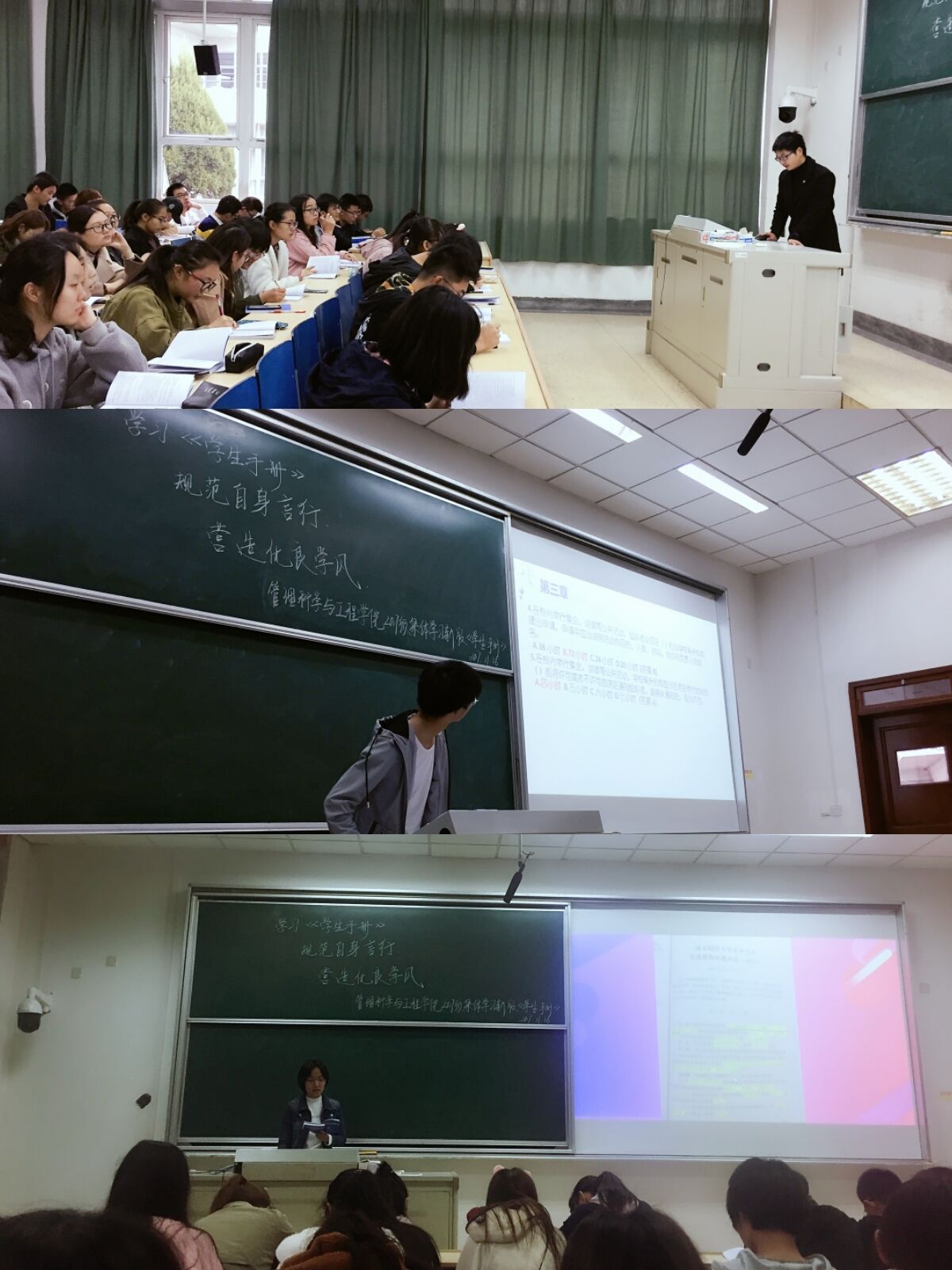 首先,郑老师结合《学生手册》的内容,说明了本次主题活动的意义和要求:以《学生手册》为指导,更好地规范自身言行,如在课堂、宿舍、图书馆等各个场所的规定;进一步增强学习动力,如学位授予的要求、学业预警的内容、评奖评优的条件;强调以德为先,诚信做人,如考试违纪处分条例等等;要求各位同学认真学习,牢记在心,落实行动。其次,工程1701班、管理1701班和质管1701班班长依次上台带领同学们分章学习《学生手册》具体内容。质管1701班班长赵新还讲解了全国英语四级的考试题型和注意事项,在倒计时30天的时候提醒同学们抓紧复习,并预祝大家顺利通过今年12月16日全国英语四级考试。最后,郑老师和工程1701班李崇同学,就班级收集整理的同学们关于大学学习和生活中遇到的困难和问题进行了指导和解答,帮助同学们更好地适应大学生活。