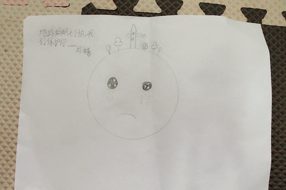 之后便进入游戏环节。在垃圾分类小测试环节,学生们竞相抢答。紧接着,同学们在观看了“变废为宝”视频后,在志愿者的带领下也开始动手操作起来。一剪一划间,那些简单透明的塑料瓶在同学们手中渐渐变成了一个个精美小巧的笔筒。这些笔筒一排排摆在一起,瓶身上贴着各种各样的图案,有小兔子,小狗,小花、机器猫、大嘴猴等。这些可爱的图案都表达着学生们对大自然,对地球母亲的热爱。随后,同学们开始为地球母亲写信。孩子们在纸上画着他们心中的地球母亲,并写上想对她说的话。很快,郁郁葱葱的树木、娇艳欲滴的花朵、垂死挣扎的小动物、高耸的烟仓、乌黑的河流跃然纸上,边上写着“地球妈妈别怕,我们保护你”、“我爱我的家园”“谢谢您,地球母亲,我们会保护好环境的”等话语。信的内容虽然简单,字里行间却流淌着对地球母亲的浓浓的爱意和深深地祝福。