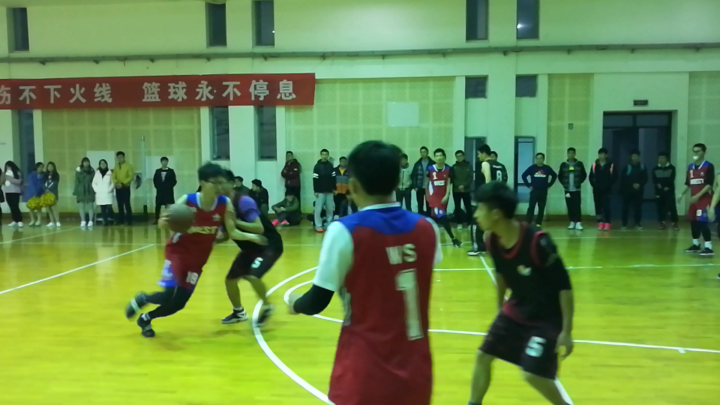 比赛开始,管工院跳得球权,但是不料被公管后卫抢断,对方先拔头筹,拿下两分。紧接着公管院采取一对一全场紧逼防守的策略,打乱了管工院的进攻节奏,导致管工院失误频频,打了一波8:2的小高潮。此时队长9号王泽挺身而出,接连在对面内线造成杀伤,并且投中一记三分球,将比分追了回来。一次暂停后,双方有来有回,最后23号范圣杰投中罚篮,管工院以18:19落后一分进入下半场。
