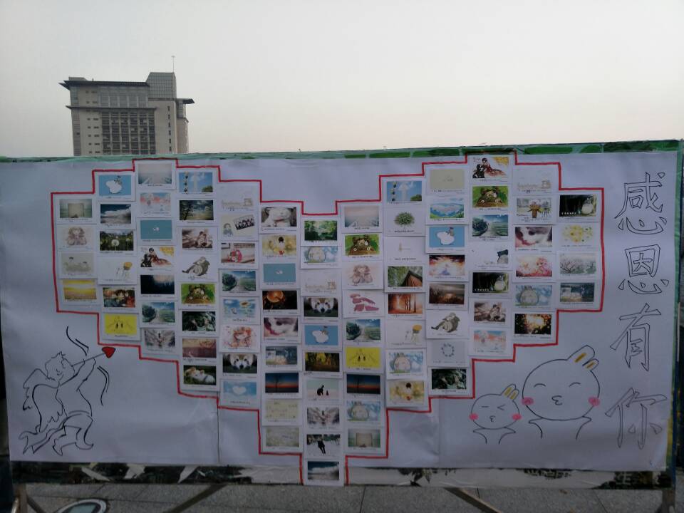 活动期间,工作人员邀请路人在明信片上写下感恩的话语。明信片在展板上组成爱心形状,代表感恩的心。所有在明信片上写下祝福的人都将收到工作人员赠送的小礼物。虽然积雪消融,天气寒冷,但现场欢声笑语,气氛热烈。明信片上被满满地写上祝福,有的感恩老师“春风化雨,润物无声”,有的感恩室友“在最美好的时光遇见你是我的幸运”,还有的感恩社团“让自己不断发现未知,发现新的自己”。