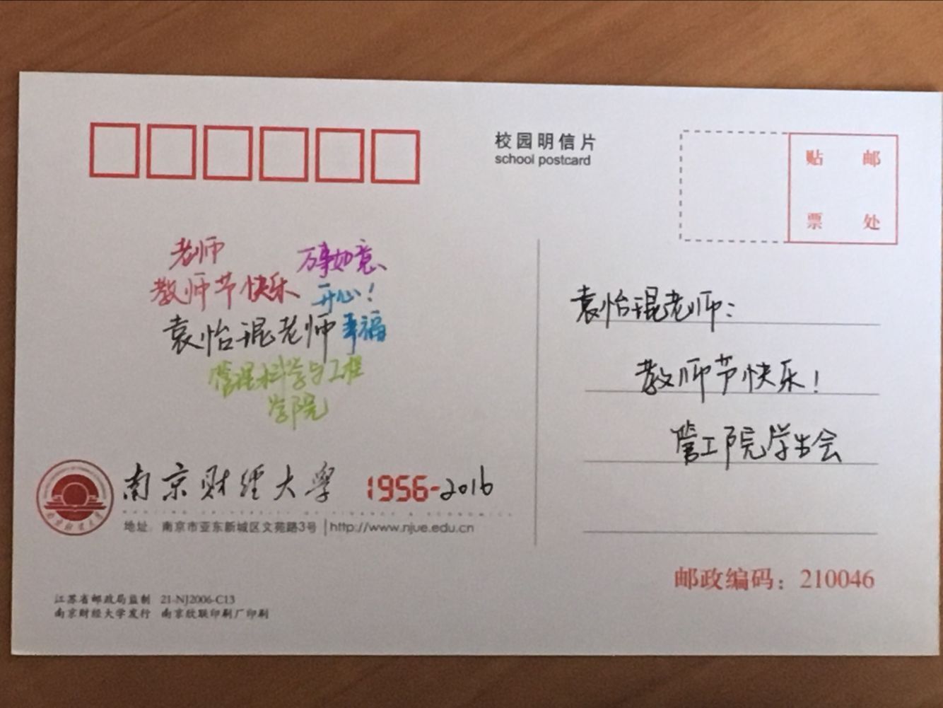收到明信片的学院党总支副书记袁怡琨老师语重心长地说道:“谢谢大家,教书育人是老师的职责,希望同学们能够把对老师的这份感激之情转化为今后学习的动力,将来学业有成,回报社会。”