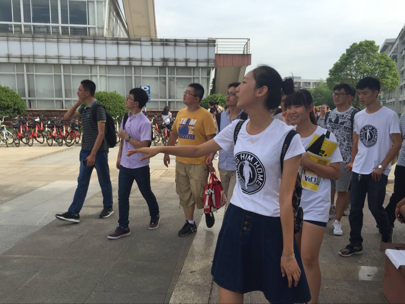 新生简单的自我介绍后,工作人员将新生按专业分为三组,每组由5人带领。大部队欢声笑语,浩浩荡荡,进发东苑。一路上,工作人员对校园智慧卡、自行车使用等相关问题进行解答。来到工科楼后,大家沿着图书馆、专业楼、行政楼、教学楼、体育馆、大学生活动中心一路前行,工作人员详细介绍了各个建筑的造型特征、功用以及路旁栽种的花草树木。新生了解到,原来图书馆的大球造型象征着一轮红日正冉冉升起,那一级级台阶宛若翻开的书本,象征着书籍人类进步的阶梯。后又途径校医院、中苑,最后,工作人员将新生送回北苑,结束了首次校园之旅。