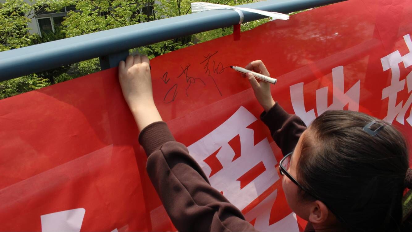 活动组织者向广大学子描述了不断恶化的地球环境,日益反常的厄尔尼诺现象、频繁的地震、消融的冰山等,我们正在经历的“地球之殇”。他倡议大家就如何保护地球,保护环境进行思考并展开讨论。现场气氛活跃,同学们争相发言。一位同学说,我们应该拒绝使用一次性餐盒、塑料袋,减少白色污染。一位同学表示,要节约用水,节约用纸,减少树木砍伐,防止水土流失。还有同学认为,应该要保护野生动植物的多样性,不肆意围猎捕捞,尊重自然规律,维持生态平衡。之后,大家在展板上写下日常的环保小措施以及对地球母亲的祝福,并在横幅上签名。