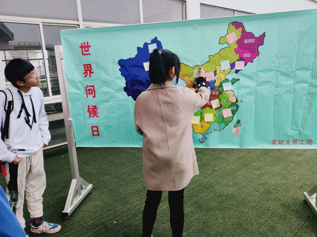 活动开始,工作人员在便签上写下各国问候语,邀请现场同学猜测其含义与所属国家并说出自己家乡的问候语。同学们将形形色色家乡问候语写在便签上,然后贴在中国地图海报上相应的位置。许多同学围观参与,现场一片欢声笑语,很快一幅问候语中国地图新鲜出炉了。