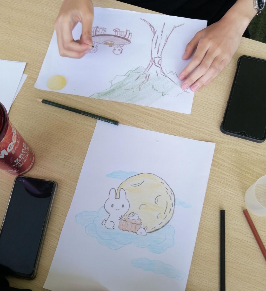 伴随着对中秋的记忆,大家纷纷打开画盒,在画纸上留下自己脑海里的中秋。周鸿露同学笔下一块块堆摞着的月饼,诉说着记忆里香甜的味道,那是团聚的喜悦。刘佳同学则画了一轮明月,她说,“仿佛看见庭如积水空明。阖家围坐赏月的场景”。蟾宫月桂背景下,一只玉兔,诉说着嫦娥奔月的故事…这是王玉月同学和曾静秋同学合作的画作。大家坐在草坪上,讲解画的内容,选出来心中最美的中秋画作。