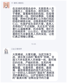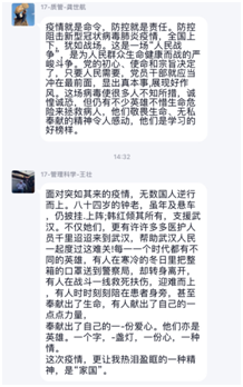 赵子夜说:“在这场同严重疫情的殊死较量中,中国人民和中华民族以敢于斗争、敢于胜利的大无畏气概,铸就了生命至上、举国同心、舍生忘死、尊重科学、命运与共的伟大抗疫精神。习近平总书记在全国抗击新冠肺炎疫情表彰大会上发表重要讲话,对中国人民在抗击新冠肺炎疫情中所展现出的伟大抗疫精神作了深刻总结,号召全社会大力弘扬伟大抗疫精神,使之转化为全面建设社会主义现代化国家、实现中华民族伟大复兴的强大力量。”黄蕾说:“为众人抱薪者,不可使其冻毙于风雪。关心、爱护广大医务工作者,就是保护我们生命健康的守护神。医务人员是战胜疫情的中坚力量,务必高度重视对他们的保护、关心、爱护。”