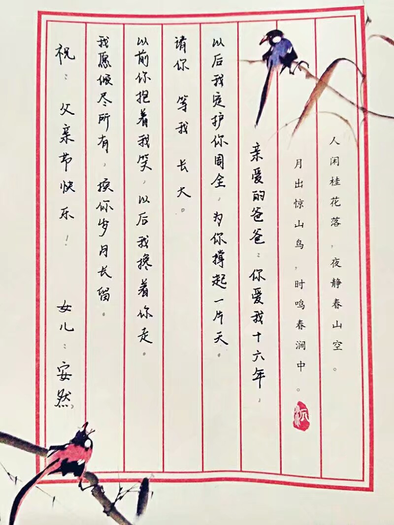 爱要写下来,父亲成长的那个年代,大家都习惯书信传情,同学们也重拾这一渐渐被遗忘的方式和父亲对话。工程1801的汤俊同学在给父亲的信中写道:“平凡又伟大,严厉又温柔,无声却动人,呆目也煽情,这是您想表达的爱。爸,您为这个小家付出了很多很多,我理解您对我的爱,希望您以后注意身体,谢谢您!”管理1901的安然同学同样在信中写道:“以前你抱着我笑,以后我搀着你走。我愿倾尽所有换你岁月长留。请你等我长大,为你撑起一片天。”