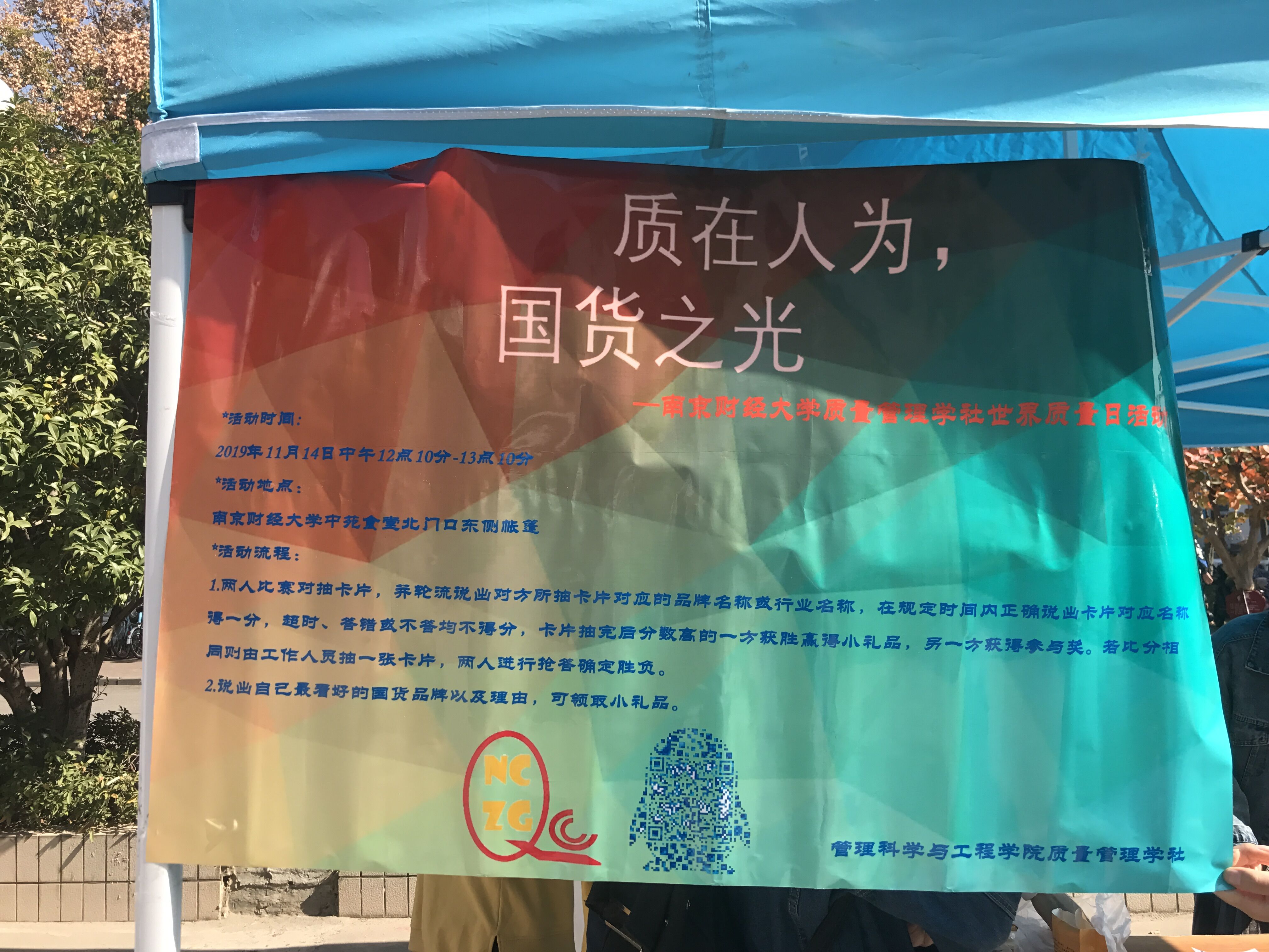 每年11月的第二个星期四是世界质量日,11月14日中午,williamhill英国质量管理学社于中苑食堂北门口成功举办“质在人为,国货之光”主题活动,此次活动在质量管理学社社长章亚玲同学的带领下,全社成员共同参与,邀请广大同学参与品牌趣味活动,旨在宣传世界质量日,引导大家重视质量,使质量观念深入人心。