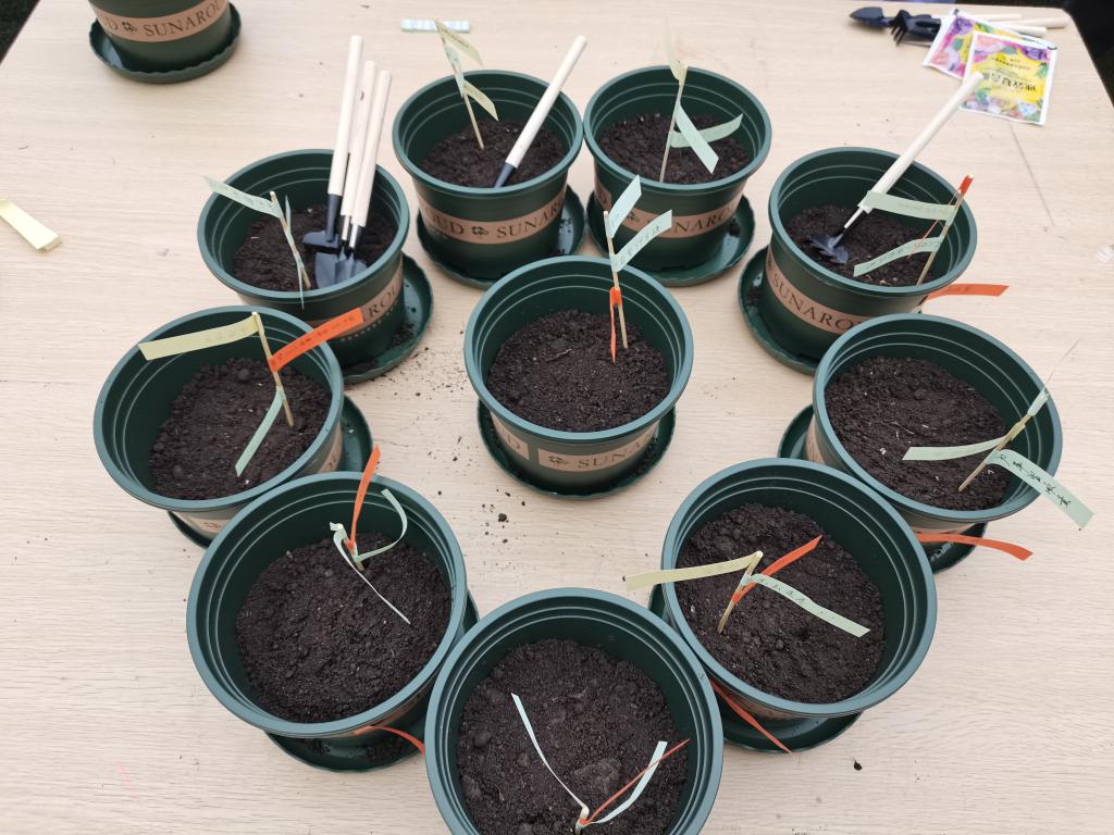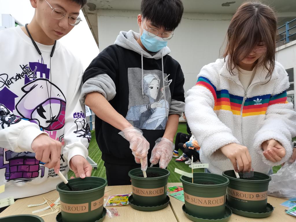 本次活动采用答题PK的形式获得种子,通过亲手种下带有专属初心的种子,让初心和种子一起长大。活动一开始,同学们纷纷在主题海报上签上自己的名字,并积极扫码参与线上知识问答。“对绿色植物损伤最大的五种气体是什么?中国近代史上最早意识到森林的重要意义和提倡植树造林的人是谁?我国古代在什么时候就有插柳植树的传统?我国从哪一年开始设立的植树节?全国统一的环境问题举报免费热线电话是多少?植树节设立是为了纪念哪一位伟人? ...”问题五花八门,同学们你争我抢现场气氛热烈。随后,同学们开始播种“初心”。刨土,撒种,浇水,他们分工合作,劳动兴致高涨,都亲手种下了绿意盎然“初心”的种子,种子各式各样,有文竹、含羞草、波斯菊、满天星、香水薰衣草等等,同时将初心写在小旗上,插入花盆中,最后将这些“初心”盆栽赠送给答题优胜者,同时也将自己的美好初心传递下去,希望它茁壮成长,向中国共产党成立100周年献礼。