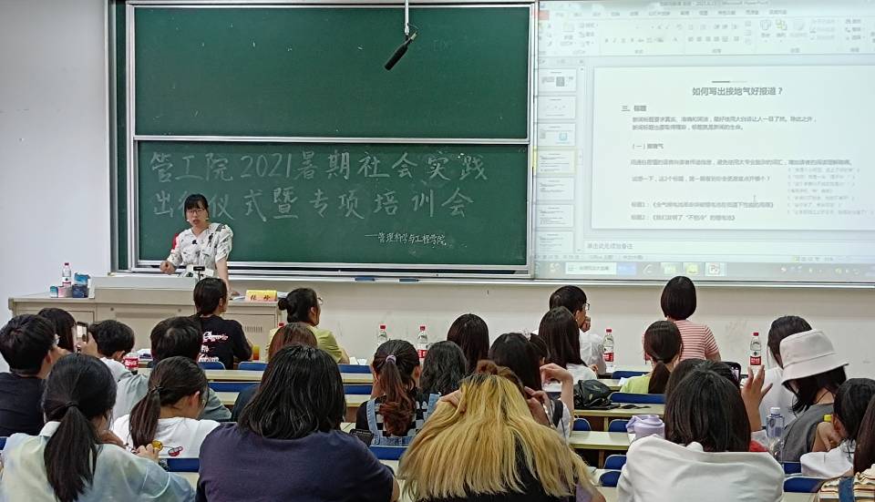 出征仪式结束后是专项培训。培训主讲人是张玲老师和范云逸同学。张玲老师以“怎样写好新闻”为题开讲,她从常规新闻撰写、好文章都有一个好选题、如何写出接地气的报道和如何不入坑等5个方面进行讲解,她的讲解逻辑清晰,案例生动,同学们积极参与互动。范云逸同学分享了自己参加暑期社会实践的经验和技巧,着重强调了认真写稿、好好拍照、积极投稿的重要性。