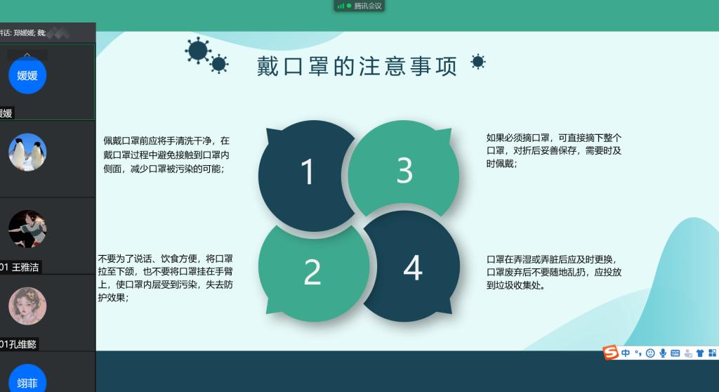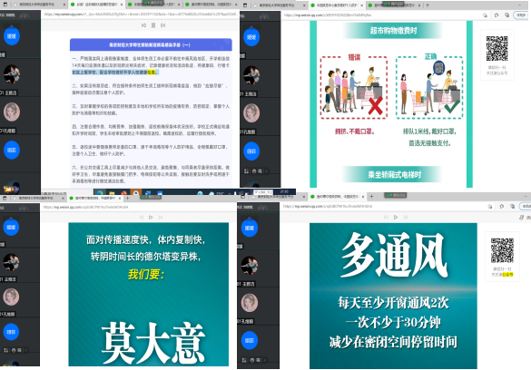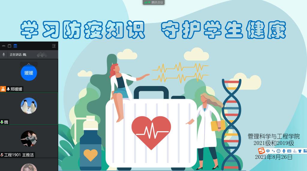 2021年8月26日晚,按照学校要求,辅导员郑媛媛老师利用腾讯会议,对所带的2021级和2019级6个班学生进行“学习防疫知识,守护学生健康”的防疫知识培训交流会,会议特别邀请了校医院负责防疫工作的魏春娟副院长指导,讲解防疫知识。